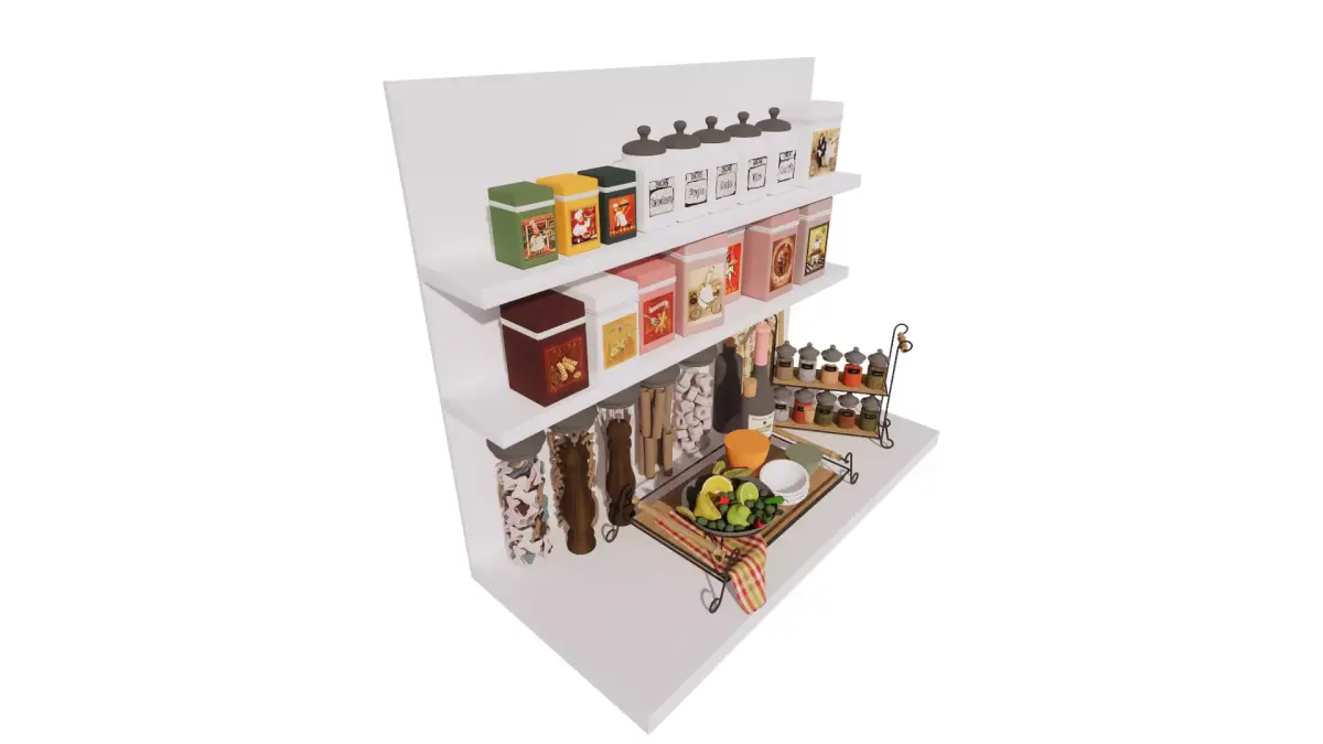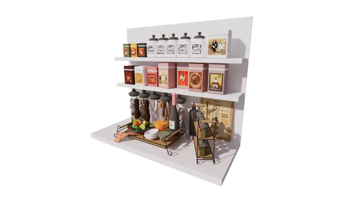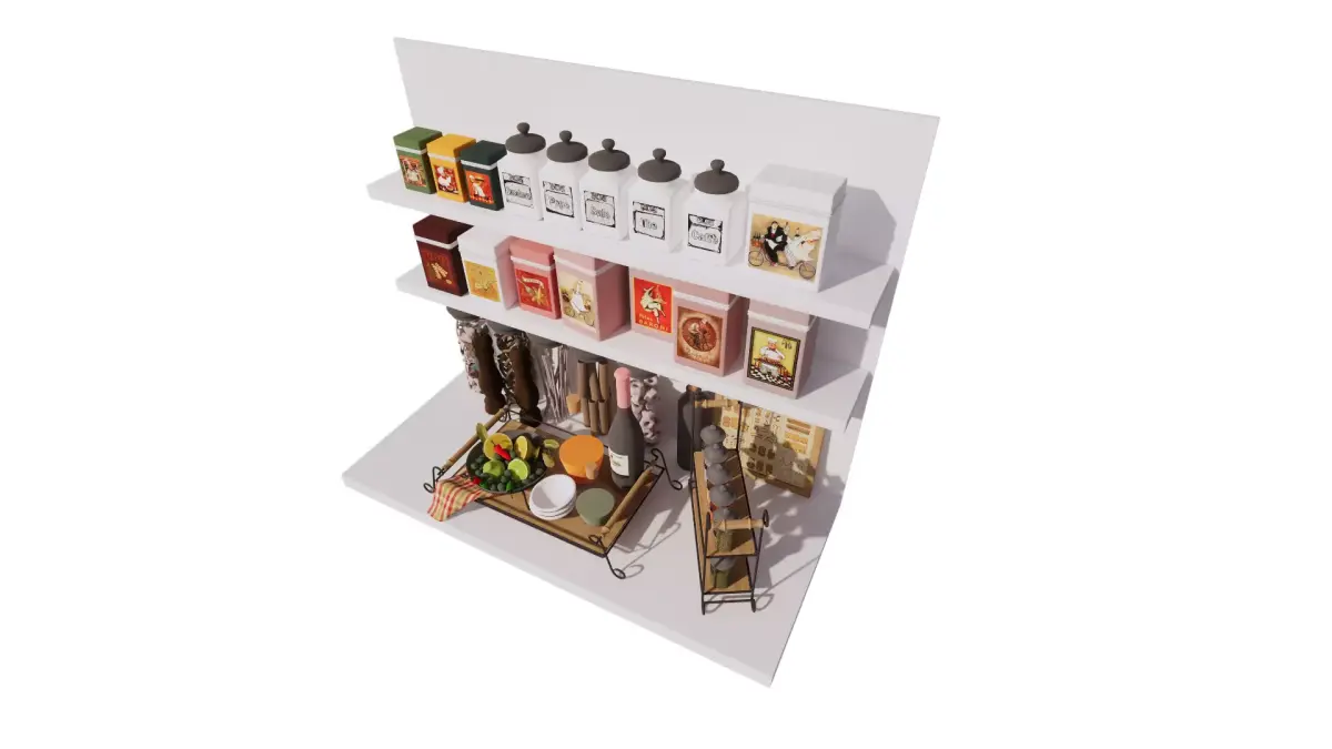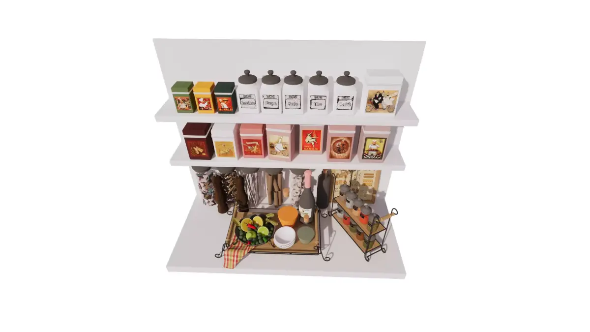 This detailed 3D scene captures a vintage-inspired kitchen shelf setup, filled with decorative storage containers and culinary essentials. The upper shelves showcase a variety of colorful tin boxes and labeled ceramic jars for coffee, tea, sugar, and spices. The lower section features tall glass jars filled with pasta, elegant pepper mills, a bottle of red wine, and a selection of spices in a metal rack. A bowl of fresh fruits and a set of ceramic bowls add a touch of freshness and realism. Perfect for interior visualization projects focused on cozy, rustic, or vintage kitchen aesthetics.