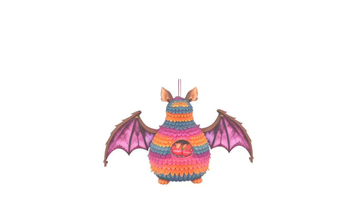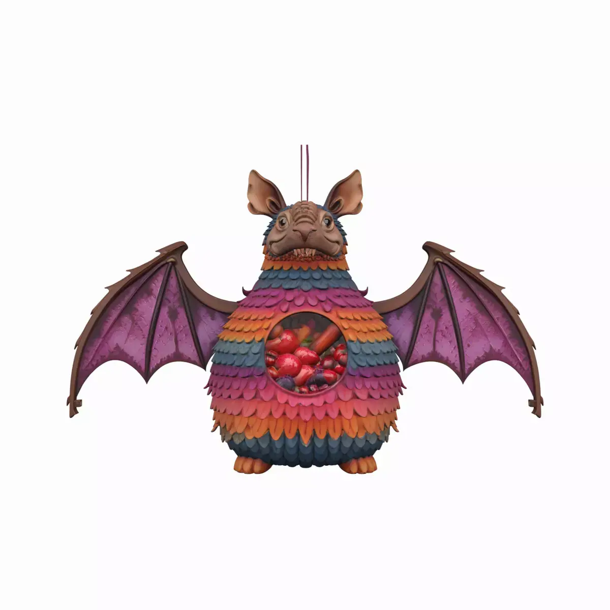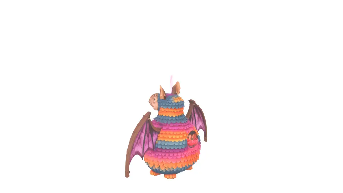 A delightful Halloween piñata bat featuring a sturdy paper mache body wrapped in vibrant crepe paper displaying intricate bat details with colorful wing patterns and glowing yellow eyes showing a mischievous expression. The back reveals a wide candy fill slot with a simple closing mechanism while the left side showcases a detailed wing flap design and the right side displays a sHighly detailed 3D model of an aged leather grimoire featuring an embossed pentagram with gold stamping, sturdy strap closure, and worn edges. Perfect for fantasy games and animations, showing front cover emboss details, back strap buckle, left side edge wear, and right side pentagram lines from multiple angles.turdy string hanger with a secure knot. The detailed rendering highlights the textural crepe paper surface and the playful Halloween aesthetic perfect for 3D party game assets with four clear views against a clean white background for easy integration into game environments.