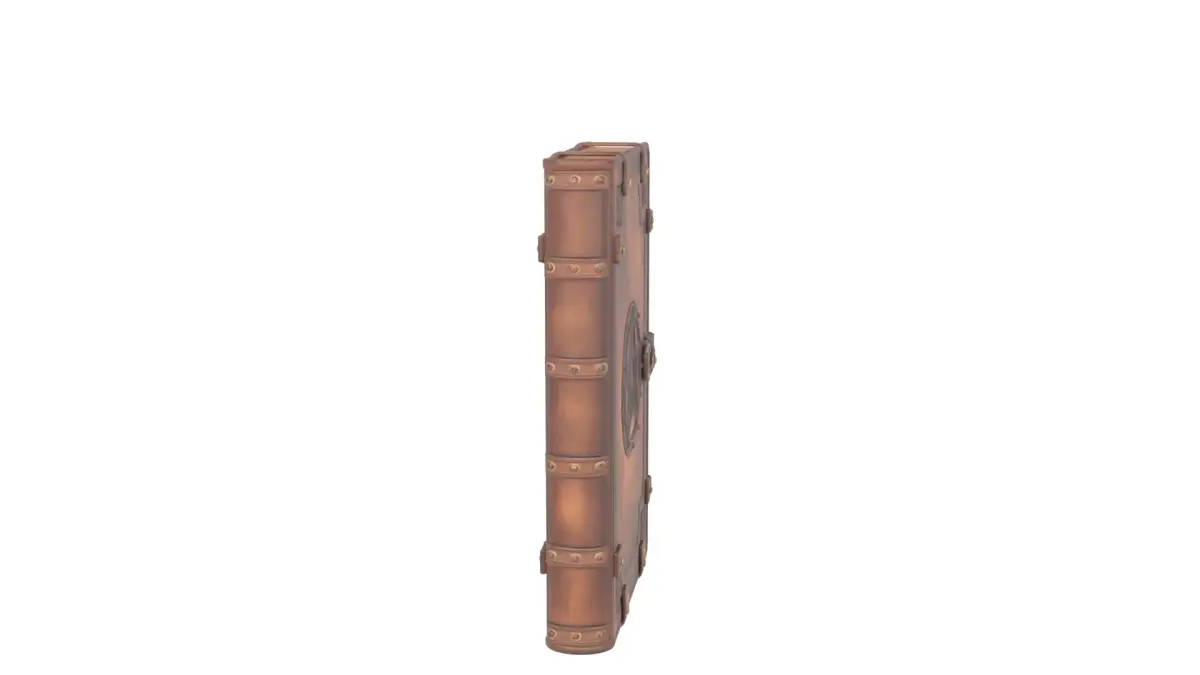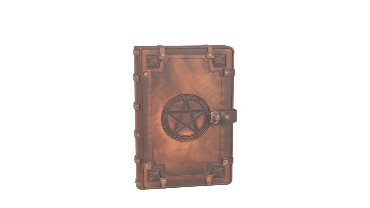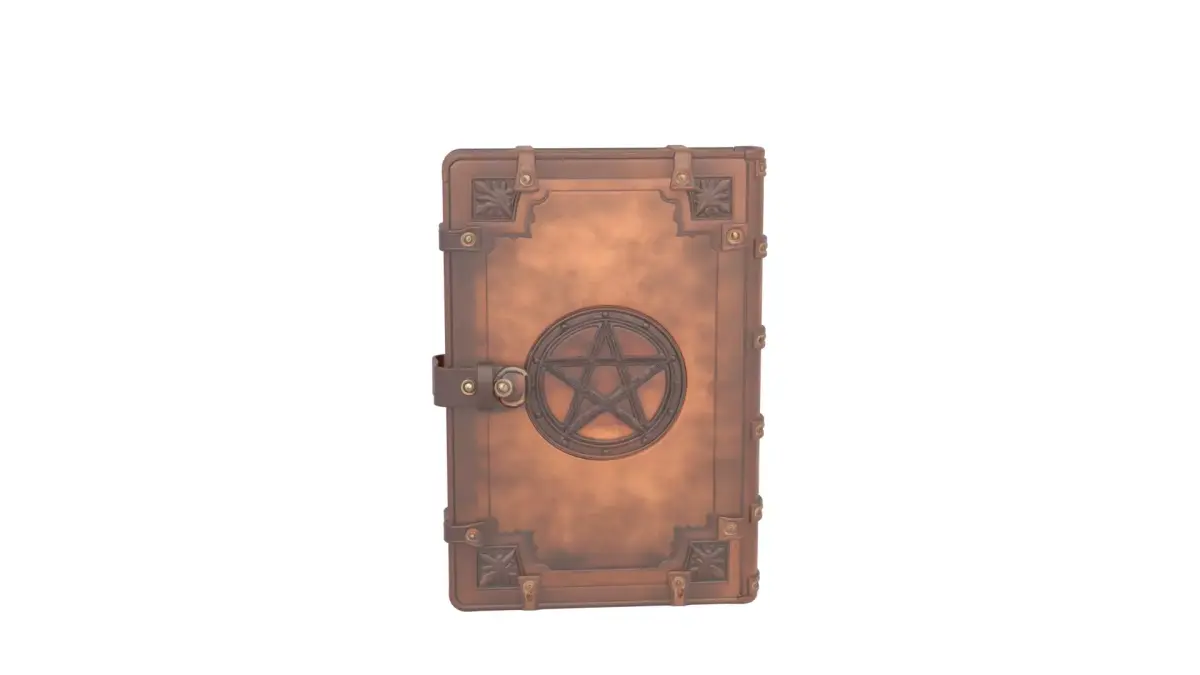 Highly detailed 3D model of an aged leather grimoire featuring an embossed pentagram with gold stamping, sturdy strap closure, and worn edges. Perfect for fantasy games and animations, showing front cover emboss details, back strap buckle, left side edge wear, and right side pentagram lines from multiple angles.
