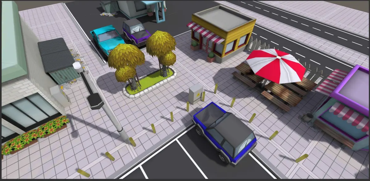 In this pack you can find:21 different buildings.city props(flower pots, street lamps, barriers, trees, tables, trash bins, umbrella stands...)4 different abandoned cars (+ different colour textures)Tileable asphalt roadsTileable grass (park) tilesTileable parking lot tiles.Also contains unitypackage (prefabs and sample scene).Whole pack is mobile-game ready (models and textures are optimized for vast majority of high-end and low-end devices).