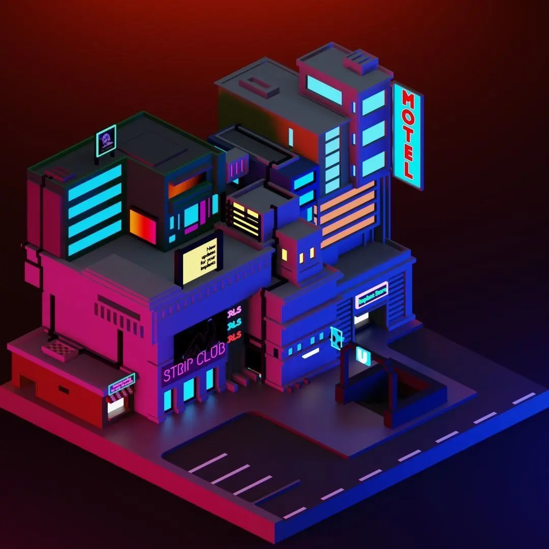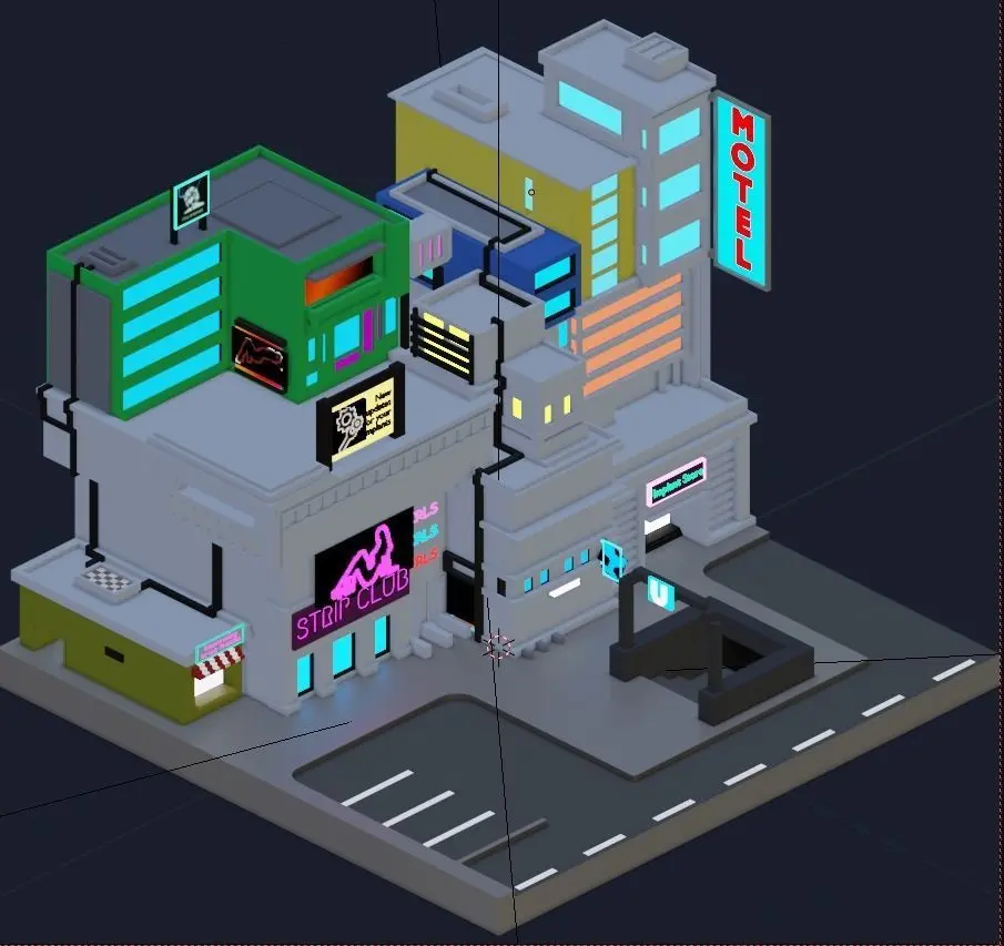 Low-poly city in the style of cyberpunk made in Blender 2.8. I use Cycle render, but you can use Eevee, too. All colors are easy to edit, no complex textures. If you have any problems or questions you can write, I will always answer.