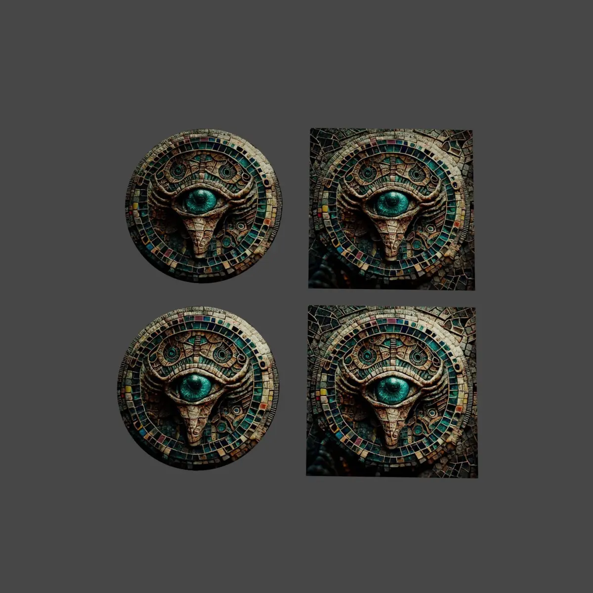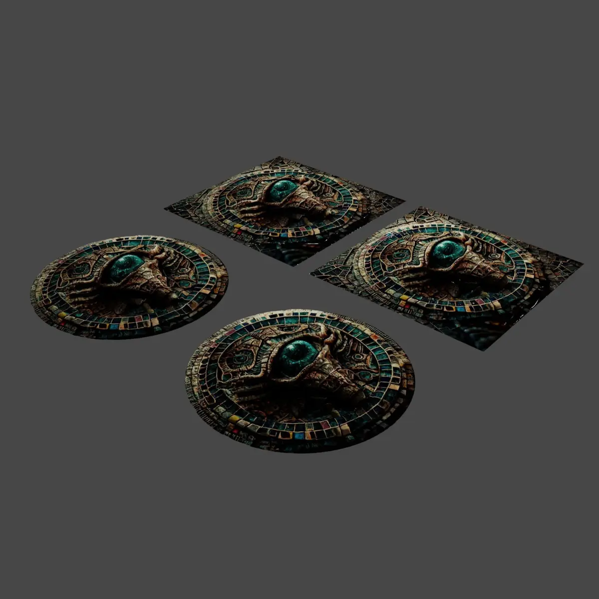 3D model and PBR textures of an ancient alien mosaic.LOW POLY CIRCLE: 1281 verts, 2269 faces.If you need to use an ultra low poly style you can add PBR textures to a simple plane and play with bump or displacement parameters.PBR: 1536x1536 png pbr textures (ambient occlusion, diffuse map, height, normal map, smoothness).Feel free to change shape and textures if you need to customize it. Royalty free license.Blender file included with shaders ready to use.