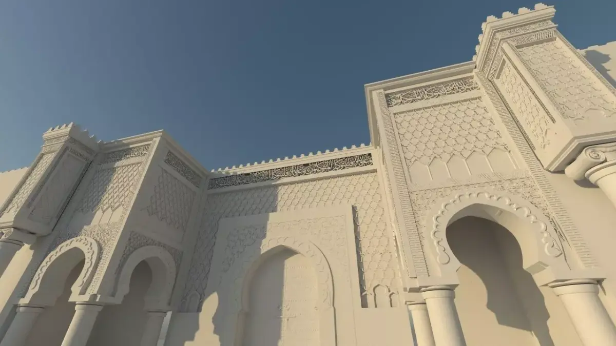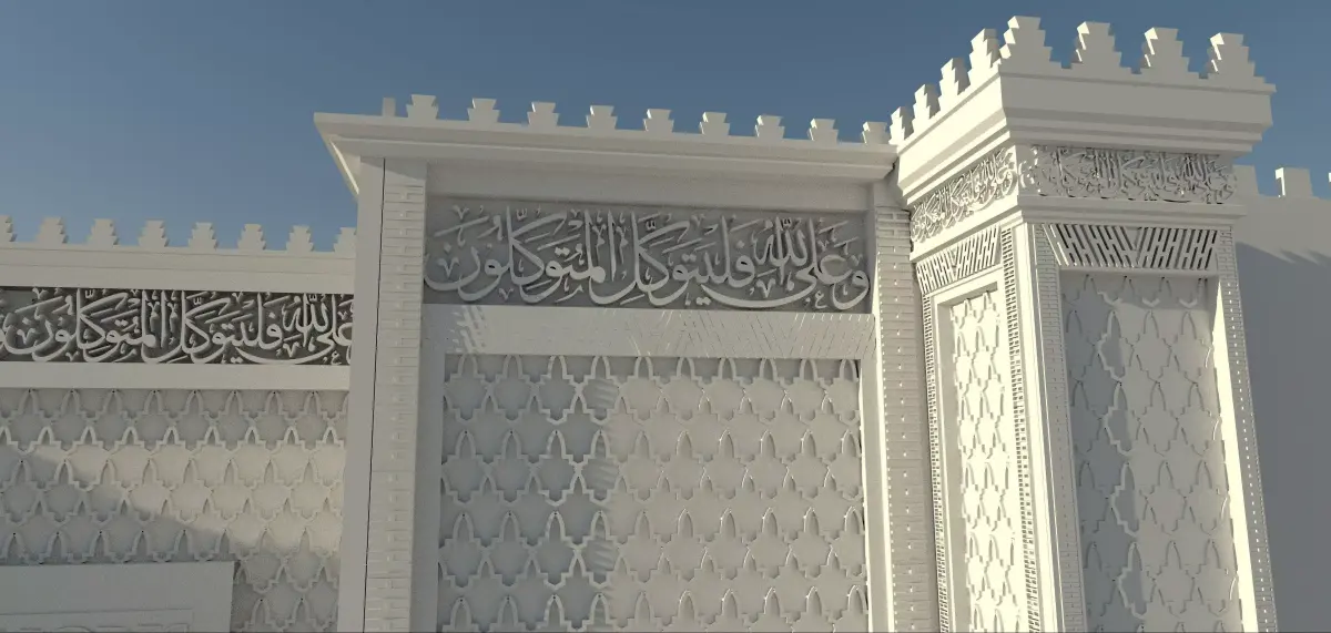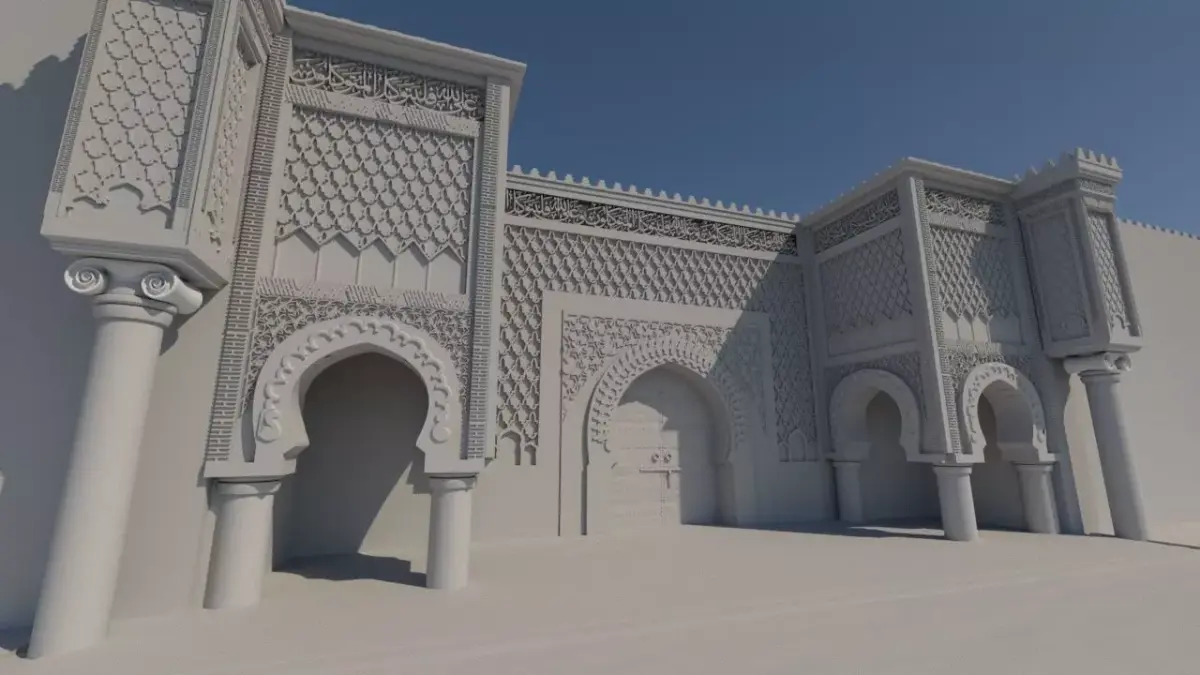 This 3D model is inspired by the Ben Mansour landmark in Meknes, Morocco, carefully designed to reflect authentic Moroccan and Arab-Islamic heritage.The model features traditional Moroccan and Arabic ornamentation, combined with artistically engraved Quranic verses, highlighting the spiritual and cultural depth of Moroccan architecture.