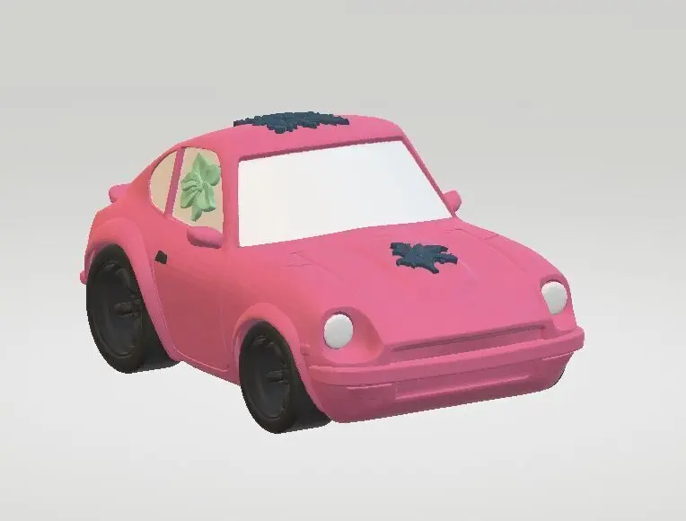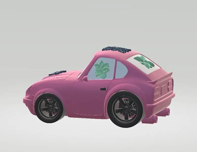 This is a charming 3D model of a cartoon-style pink car, designed with a playful and vibrant aesthetic. The car features a smooth, rounded body with exaggerated proportions, large front headlights, and a wide windshield giving it a friendly, animated appearance. Decorative floral or leaf-like emblems are placed on the hood and roof, adding a unique artistic flair. Ideal for use in kids’ games, animated films, VR environments, or mobile apps, this model captures a fun, whimsical vibe that appeals to younger audiences and casual gaming themes.