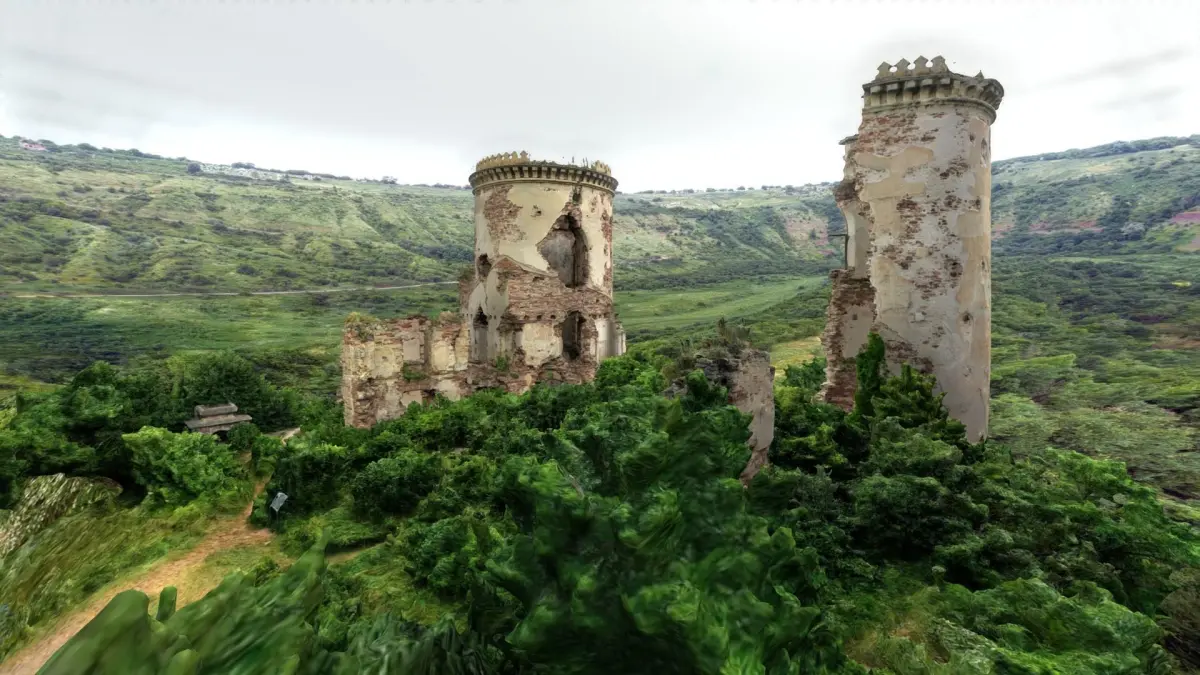 The surrounding landscape is also represented in the model, depicting the steep hill, the deep valley of the Dzhurin River, and the overall topography of the area. This attention to detail adds depth and realism to the virtual representation, allowing users to appreciate the castle's strategic location and the natural beauty of its surroundings.