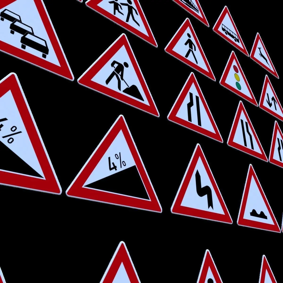- General caution- Crossroads with right-of-way from the right- Dangerous Curve to the left- Dangerous curve to the right- Double curves, first to left- Double curves, first to right- Steep hill downwards- Upward gradient- Bumpy road- Slippery road- Side Winds- Road narrows on both sides- Road narrows on the right- Road narrows on the left- Roadworks- Traffic queues likely- Two way traffic ahead- Traffic signals- Pedestrians,- Children crossing- Bicycles crossing- Wild animals crossing- Buses crossing- Level crossing