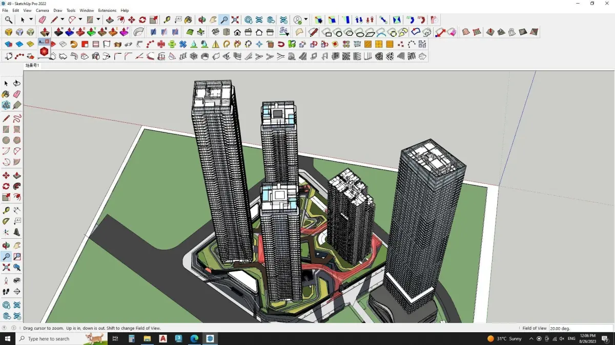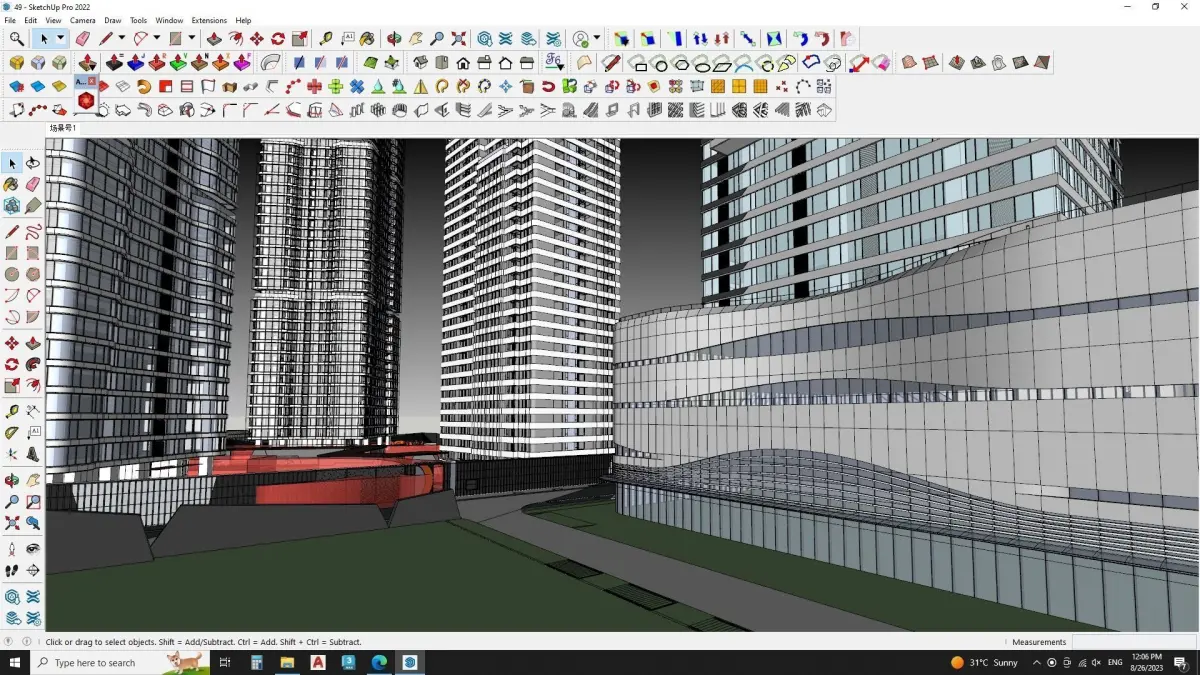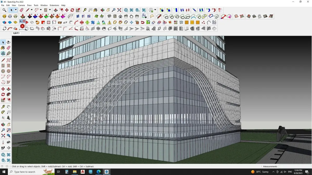 The building is a large, rectangular structure with several windows.includesBoundary walldisplay LEDSPedestrian Pattern designsOffice buildingOutdoor semi shadeBoundary wall designMaster plan