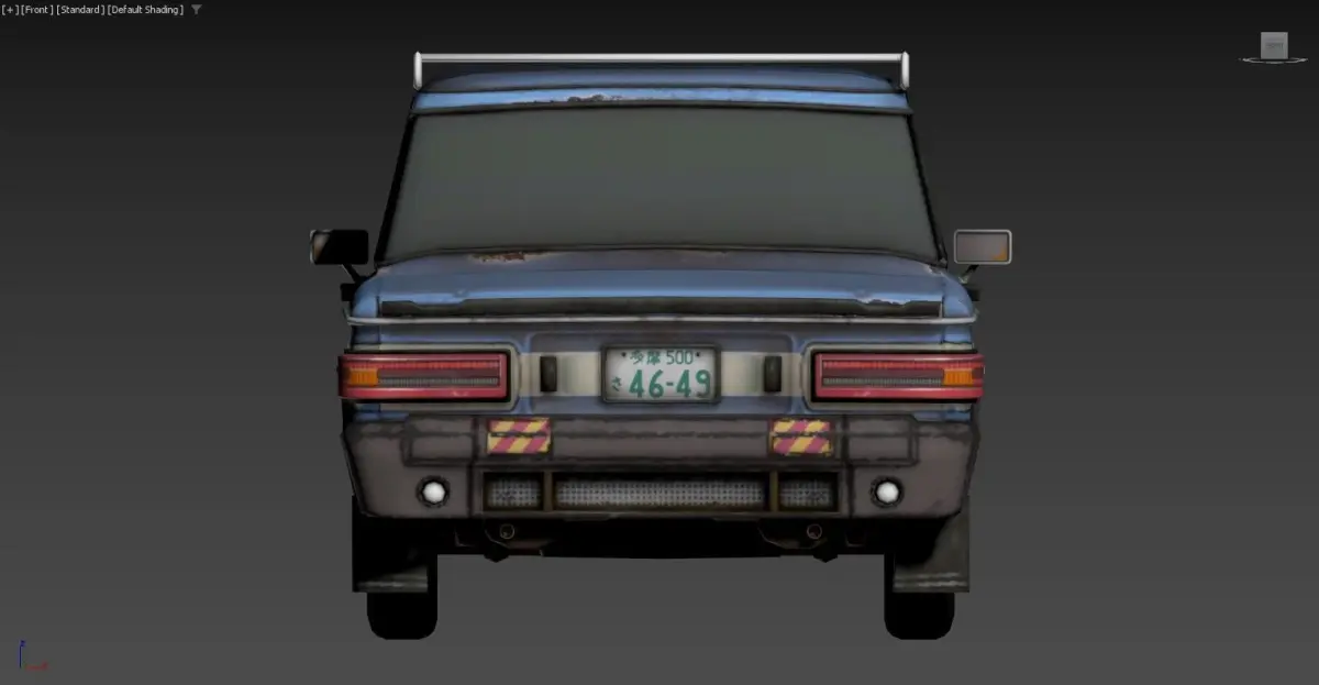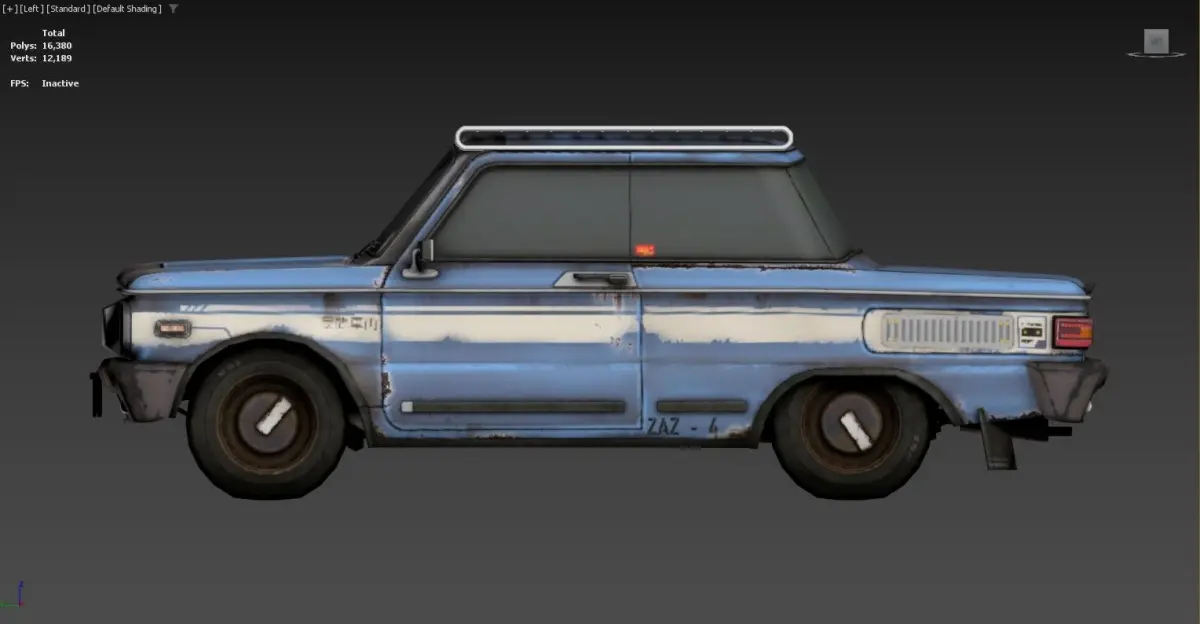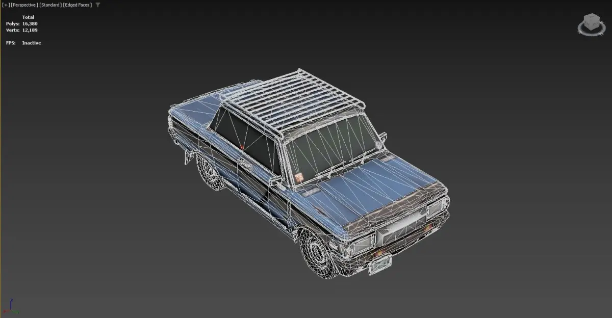 3D model of a car with a roof rack. The car appears to be an older model with a boxy design and some visible wear and tear, such as rust and scratches. The roof rack is made of metal bars and is mounted on top of the car. The car has tinted windows, side mirrors, and a front license plate. The background is a dark gradient, and there are some statistics displayed in the top left corner of the image.