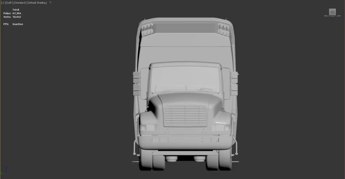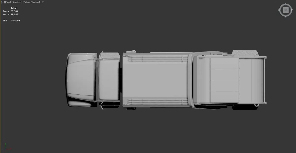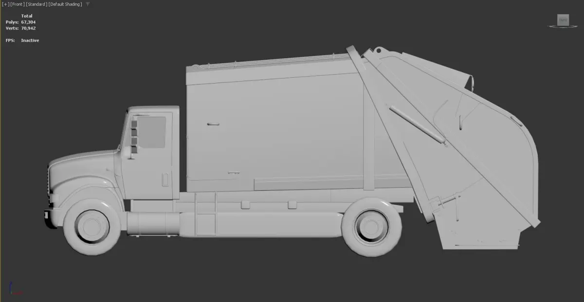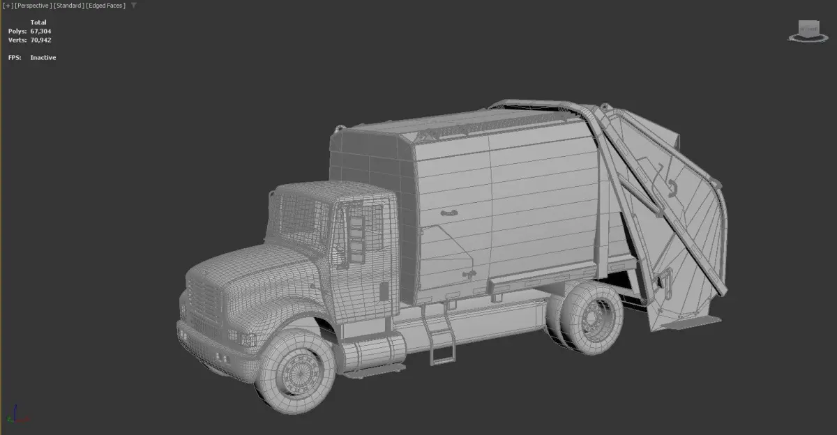 3D model of a garbage truck. The model is displayed in a 3D modeling software interface, with the perspective view selected and default shading applied. The truck is detailed, showing various components such as the cab, wheels, and the rear compactor mechanism.