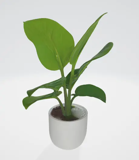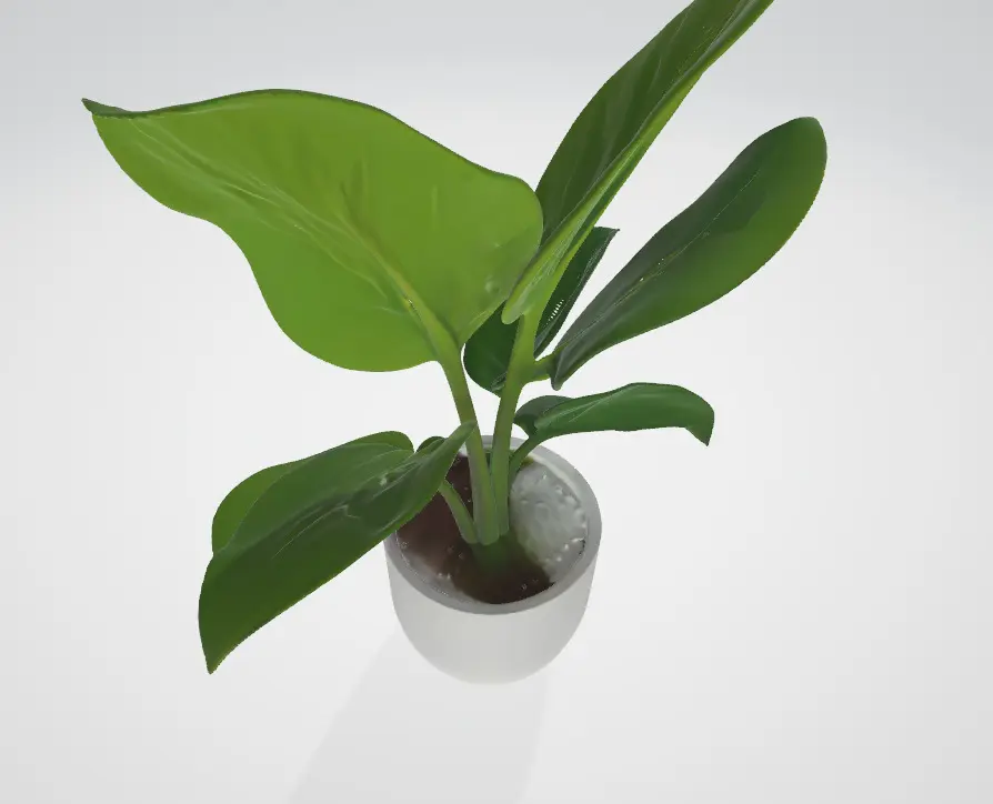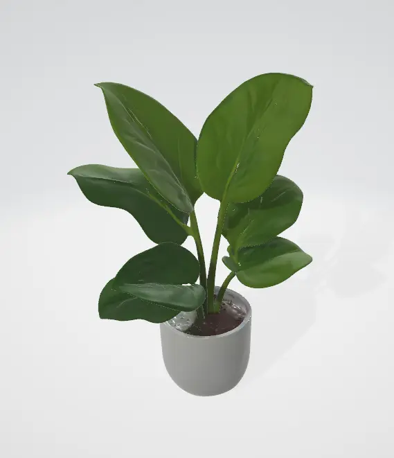 This 3D model features a lush, vibrant green plant with large, glossy leaves that have a natural, organic appearance. The plant has a well-rounded, healthy look, with varying leaf sizes and subtle shade differences, creating a dynamic and realistic texture. The leaves are soft and curved, each one having a slightly different shape to reflect natural growth patterns. The plant is potted in a simple, minimalist ceramic pot with a smooth, polished finish, giving it an elegant and modern aesthetic.