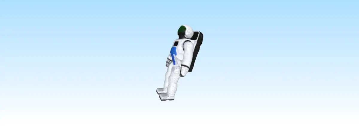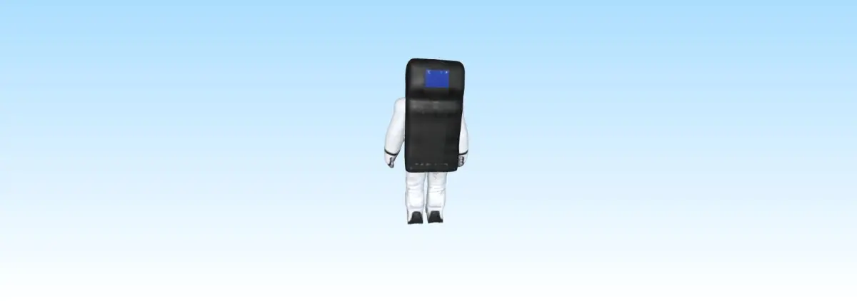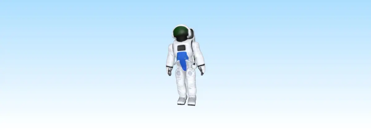 A highly detailed 3D model of a space explorer suit featuring a layered, reinforced design with visible seams and padding. The helmet includes a reflective visor and breathing components, while the suit has a functional backpack with control panels and hoses. Textured gloves and boots provide grip, and the suit displays mission patches, an ID tag, and a flag. The color scheme is primarily white with gray and blue accents, featuring realistic wear and tear. Ideal for digital applications.