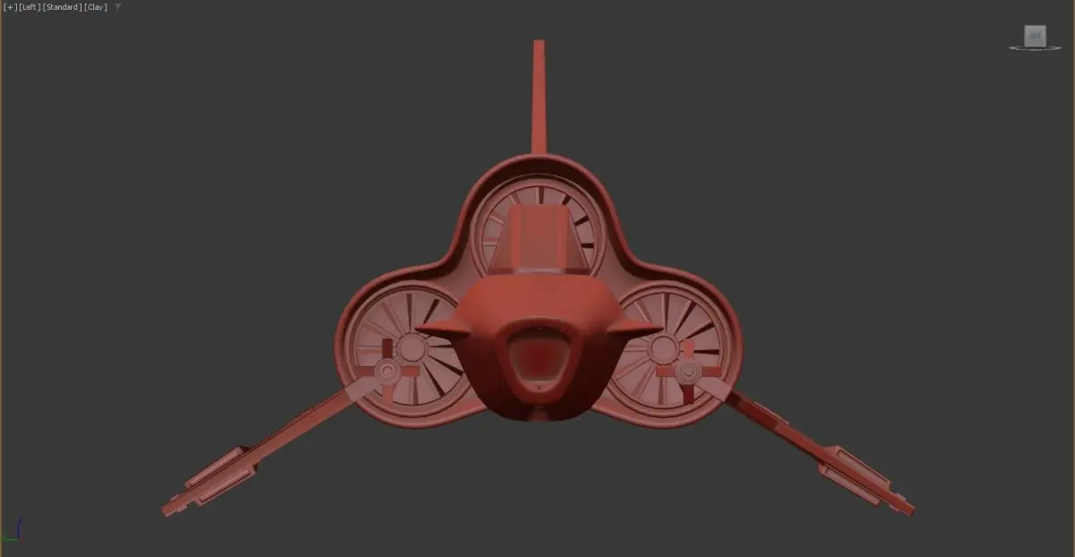 3D model of a spacecraft or futuristic vehicle rendered in a clay material. The model has a sleek, aerodynamic design with a pointed nose, a cockpit area, and large cylindrical engines at the rear. There is also a weapon or cannon mounted on one of the wings. The background is a dark gray, and the model is displayed in a 3D modeling software interface.