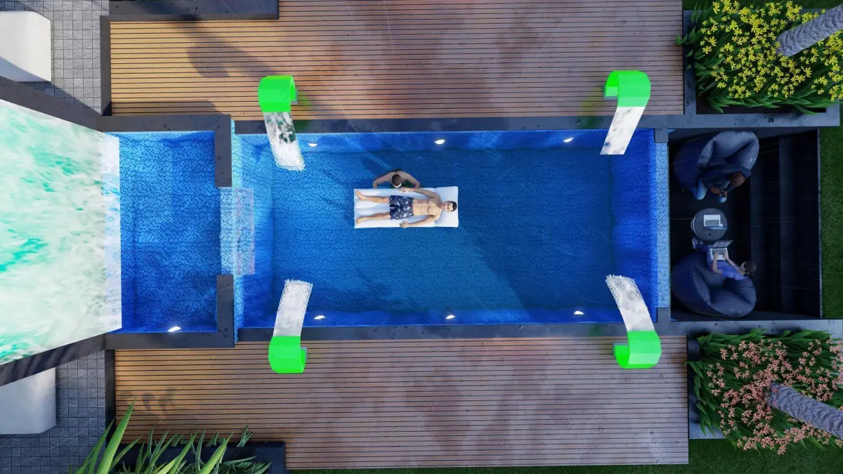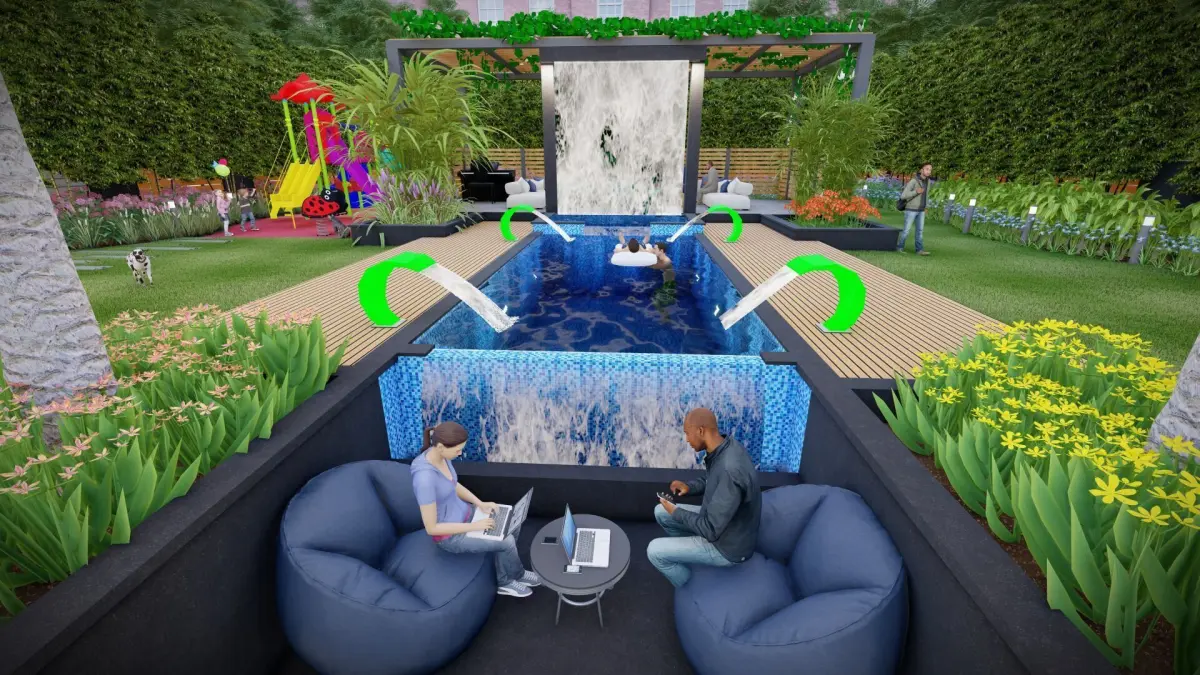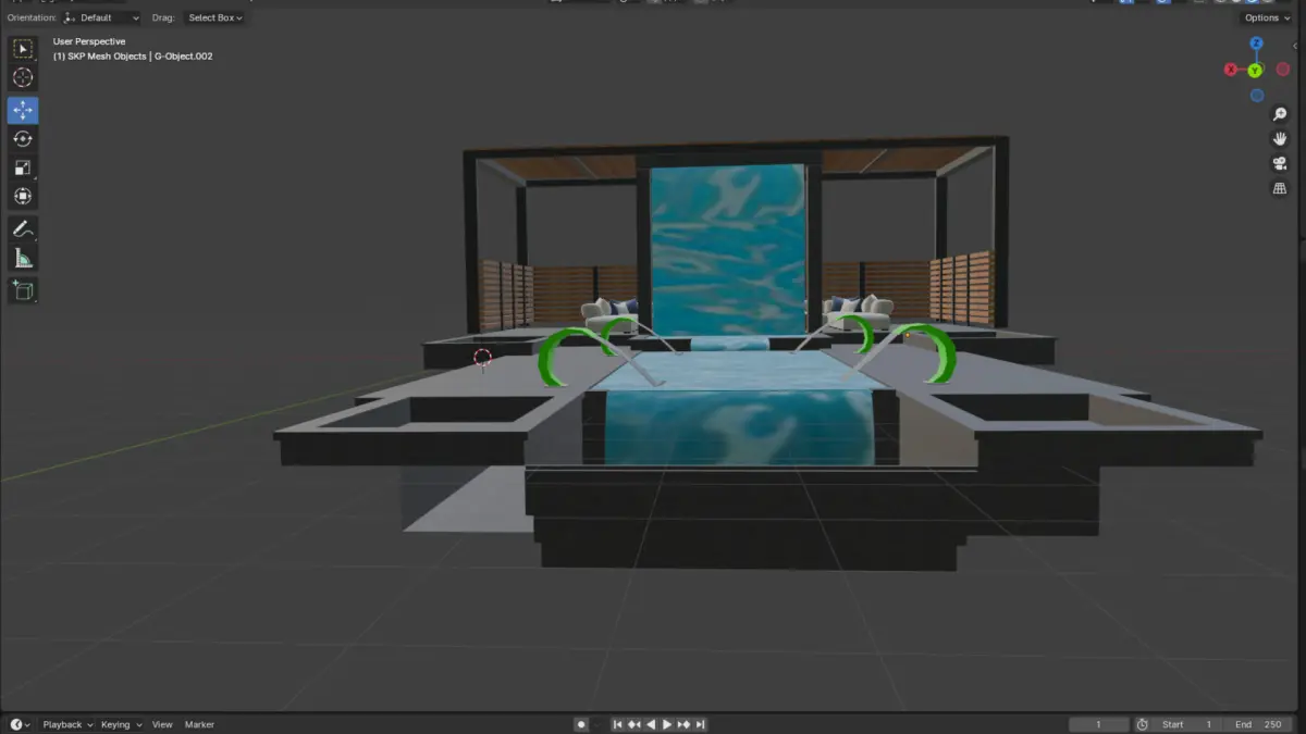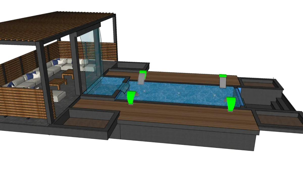 High-Quality 3D Model of a Swimming Pool with Wooden Deck, Pergola, Seating Area, Cobra Water Fountain & Water Cascade (SketchUp/Blender)
