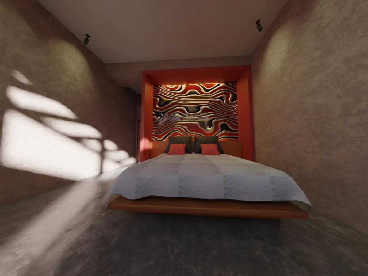 This download contains bedroom model with a privte balcony concept. The Bedroom has a bed, with simple nightstand onboth sides of the bed.two big pillows and two small pillows are provided on the bed.The Bed has a matress covered with bedsheet, bedsheet texture not included.The Decoration above the bed is a PBR texture and its being lighted with two area lamps, one above and another from below.The Entry to the bedroom is through a design door.The wall & floor of the room is decorated with PBR textures, to give contrast beyween wall and floor, the floor is given black shade while the wall is provided with more white and brown color. the floor is more shiny and the wall is given rough texture.