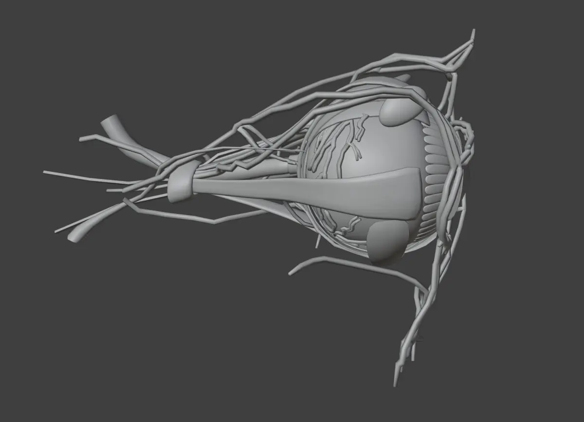 This 3D model of complete eye anatomy provides a highly detailed and anatomically accurate representation of the human eye and its surrounding structures. It highlights key components, including the cornea, iris, pupil, lens, retina, macula, optic nerve, and vitreous body, as well as external features such as the sclera and extraocular muscles. The model also demonstrates internal layers and pathways involved in light refraction, focus, and visual signal transmission.