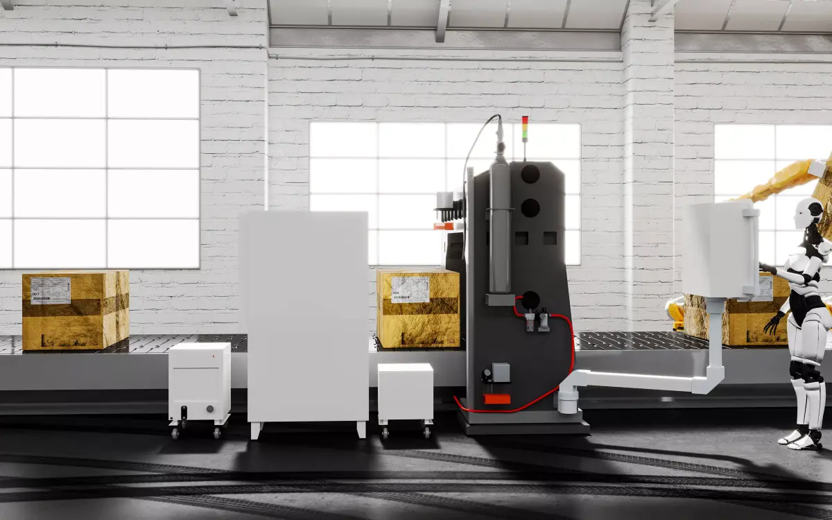 This is a very detailed 3D model of a conveyor belt robot replacement production line, which you can use to create projects and learn how to render.