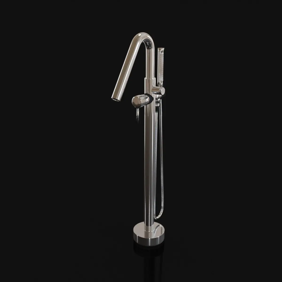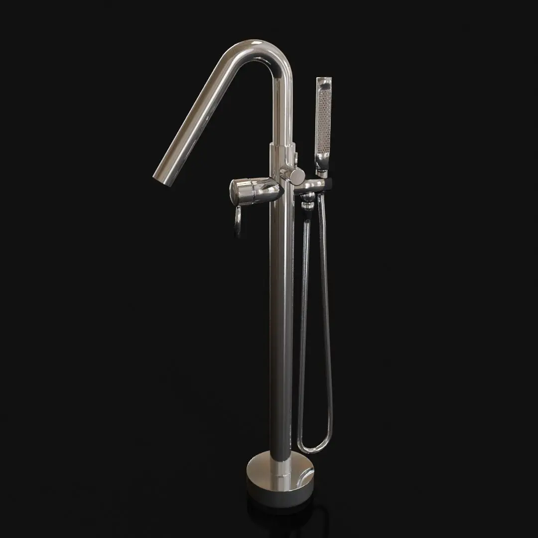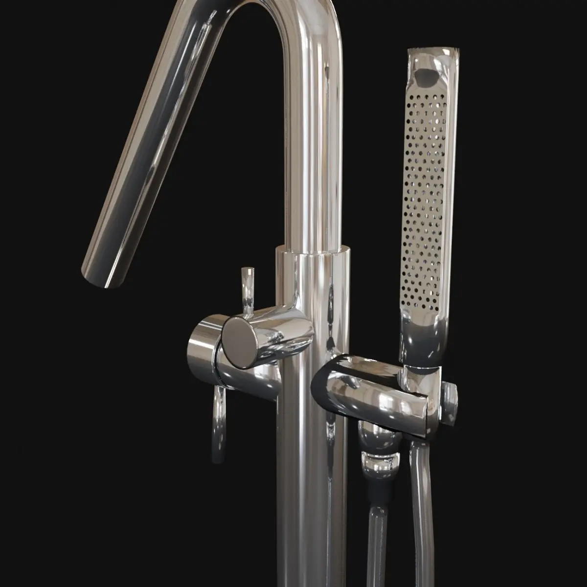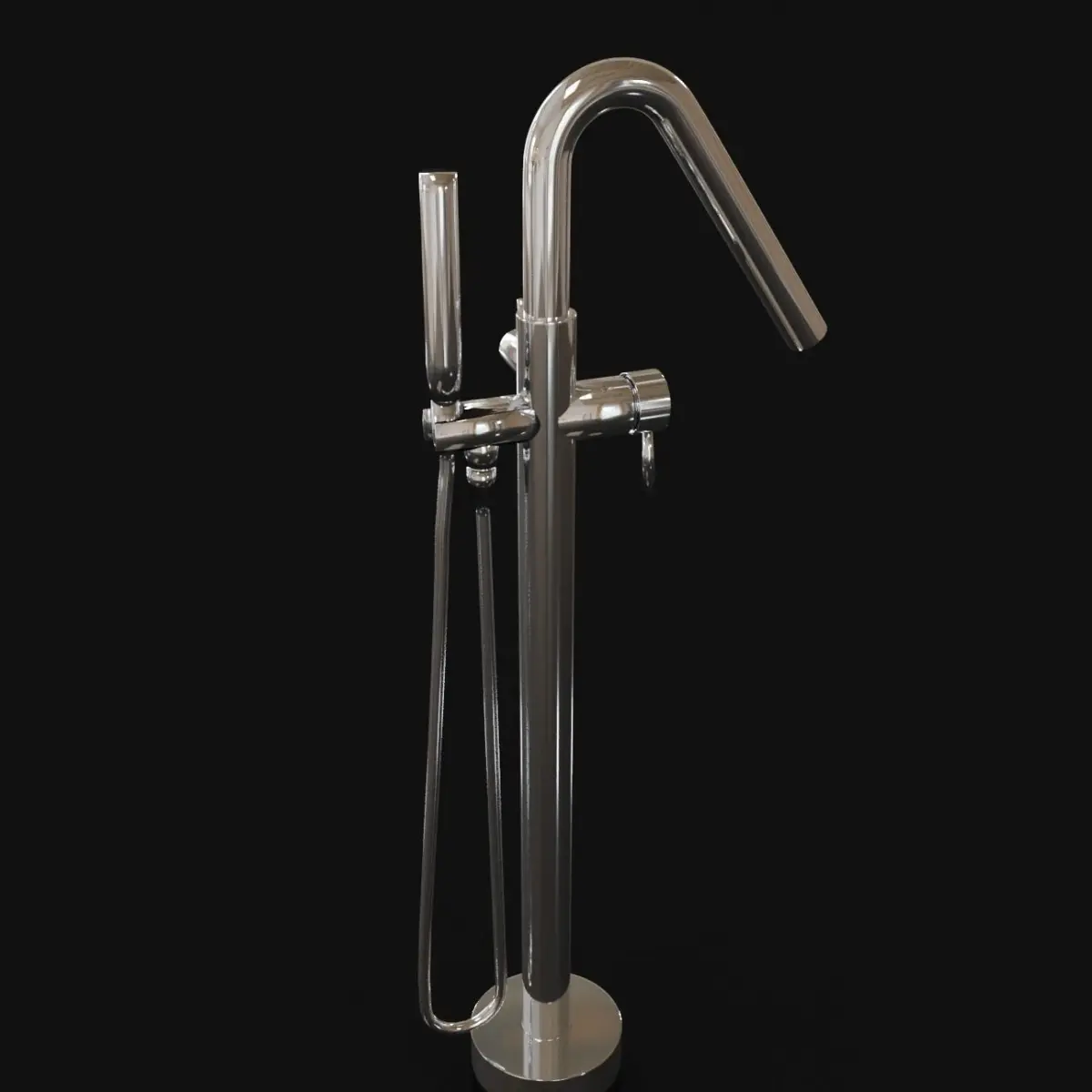 3D Model of Floor Mounted Tub Filler - FaucetThe Floor mounted faucet is modeled in blender.The Texture for bathroom wall and floor and also environment hdri are removed.Textures can be downloaded from free websites and same can be easily added in node editor, by just adding the texture file..FBX and .OBJ model also available.