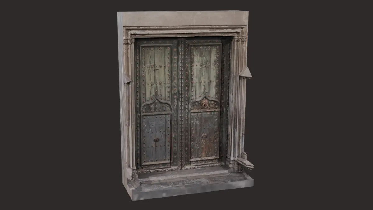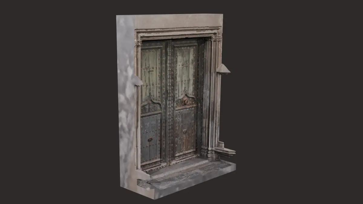 Highly detailed 3D model of the iconic Girona church door, showcasing hyper-realistic textures created using advanced photogrammetric techniques. The model captures intricate details and weathered surfaces, reflecting historical architecture.