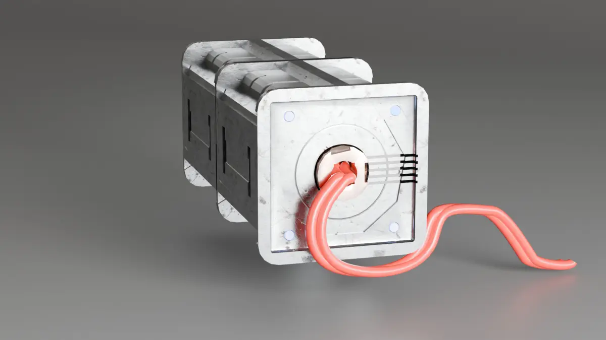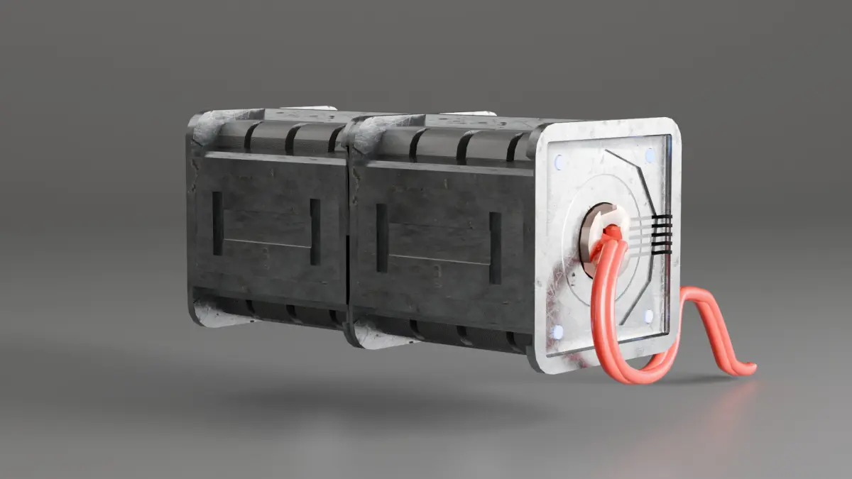 The image showcases a detailed 3D model of a SIFY generator, created using Blender's hard surface modeling techniques. The generator features a robust, industrial design with a metallic texture. It consists of two main rectangular components connected by a central hinge or joint. The left component has a red cable extending from it, adding a touch of realism to the model. The right component has a circular element with a copper-colored detail, possibly representing a connection or interface point. The model is rendered with a smooth, grey background, highlighting the intricate details and craftsmanship of the generator