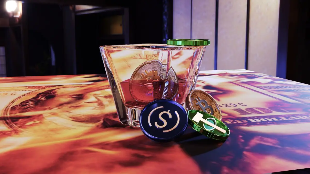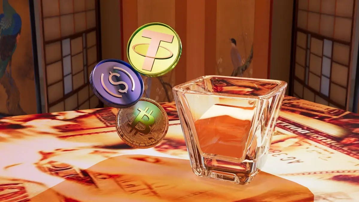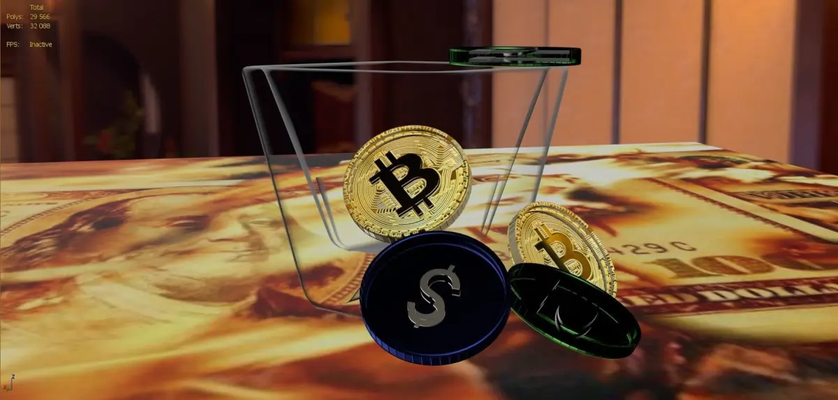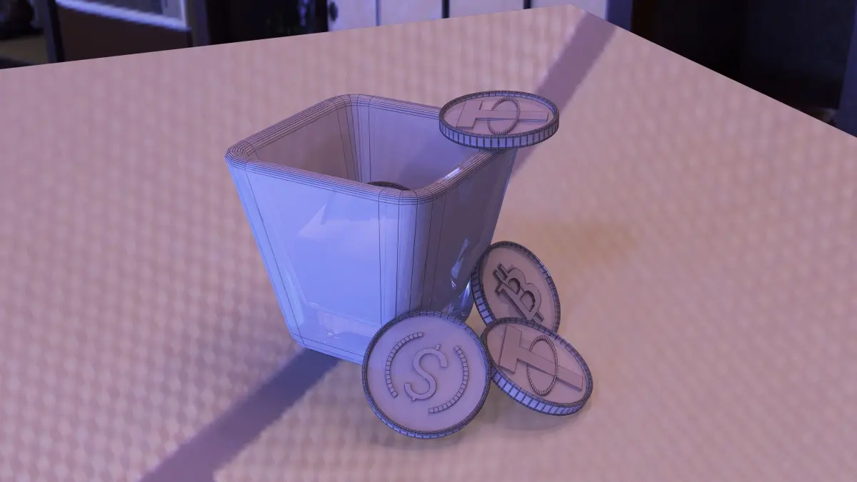 3D model of three cryptocurrency coins: Bitcoin, tether, and USDC. It turned out local but beautiful. A glass as a gift. Coin diameter 40mm(+/-). Everything is done in 3D-MAX with Corona render.