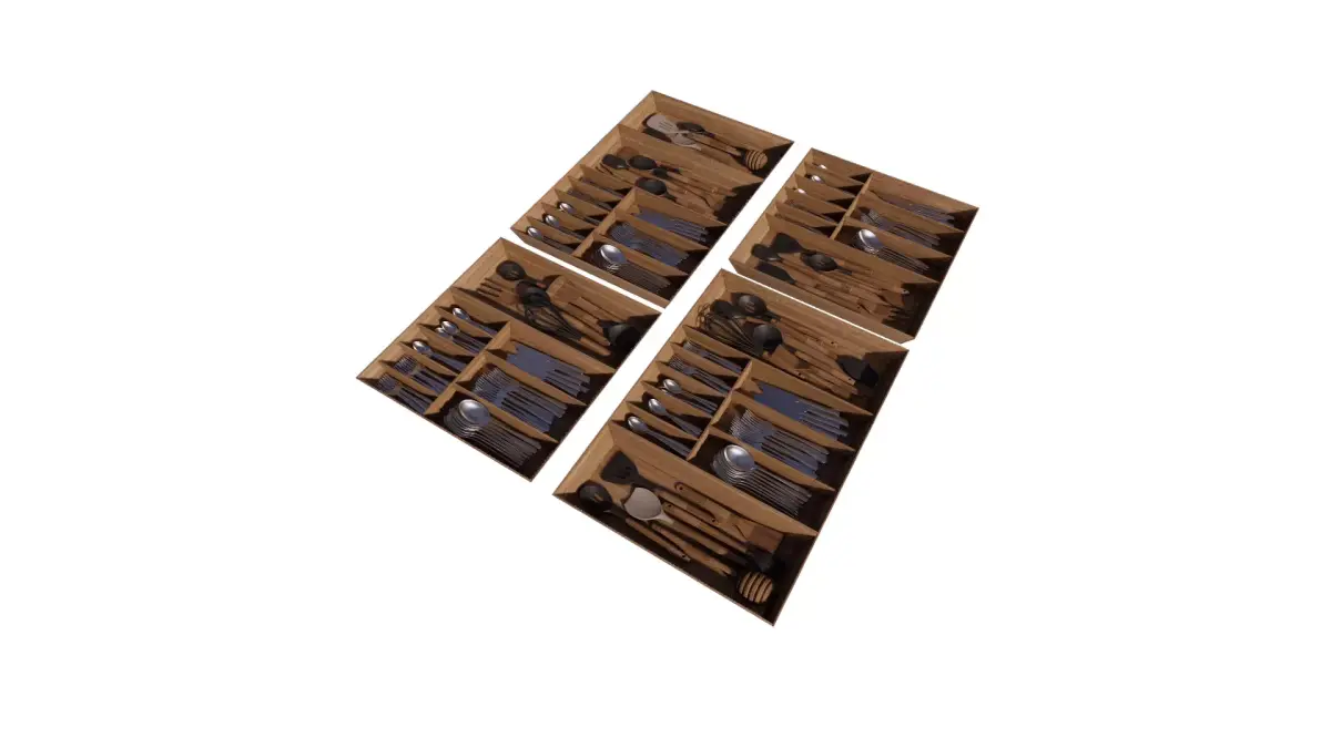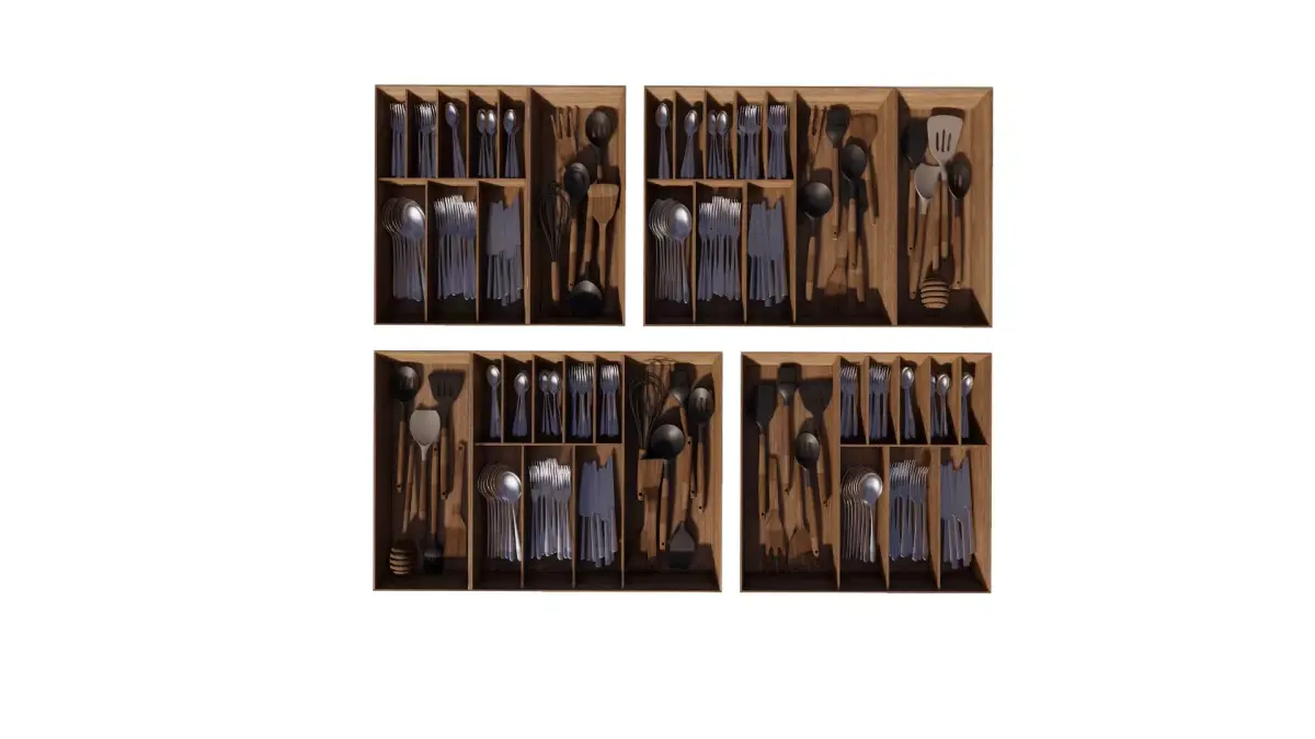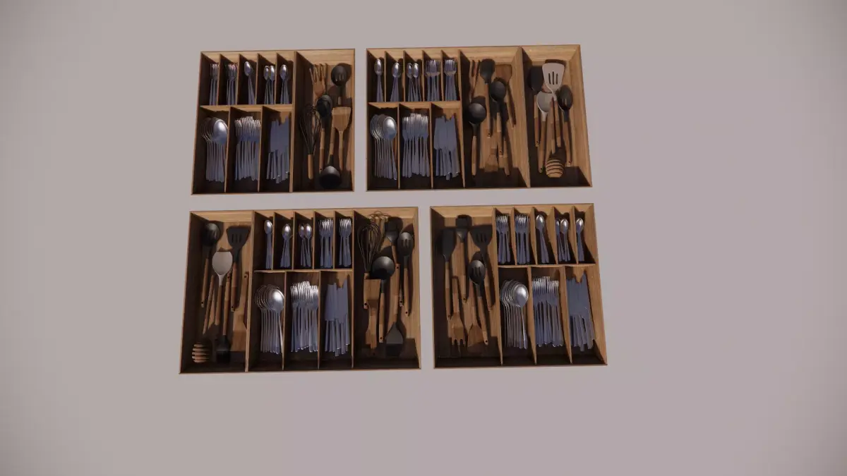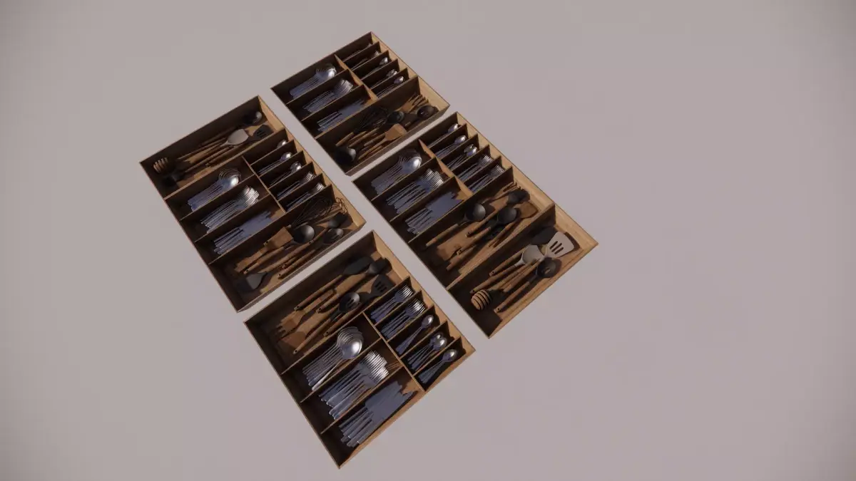 This 3D rendering depicts a neatly arranged set of wooden cutlery drawers, each compartment carefully designed to store spoons, forks, knives, and various kitchen utensils. The realistic materials highlight the polished metal of the cutlery and the natural wood texture of the dividers, creating a clean and functional kitchen organization concept. With attention to detail and balanced lighting, this visualization is ideal for interior design presentations, product showcases, and modern kitchen planning.