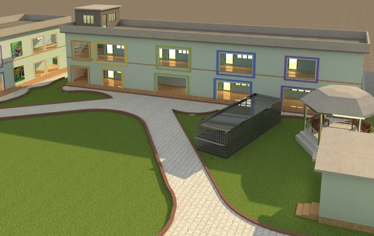 A 3D school model with a sports complex and children's park is a virtual representation of a school that includes all the features of a real-life school, with the added benefit of being able to explore and interact with the space in three dimensions.