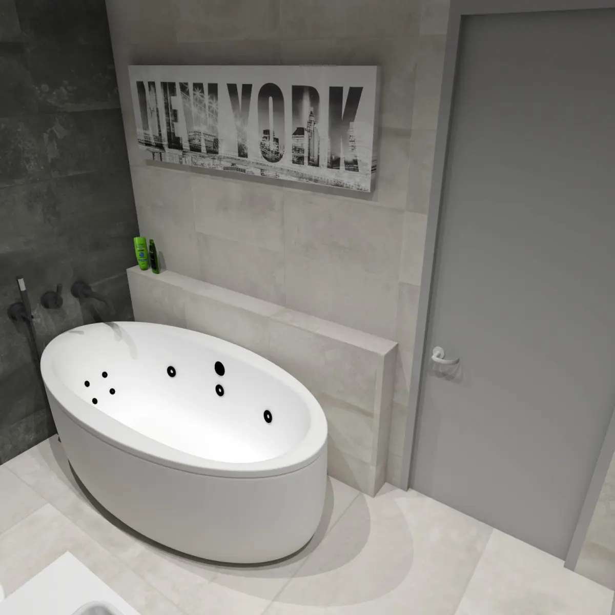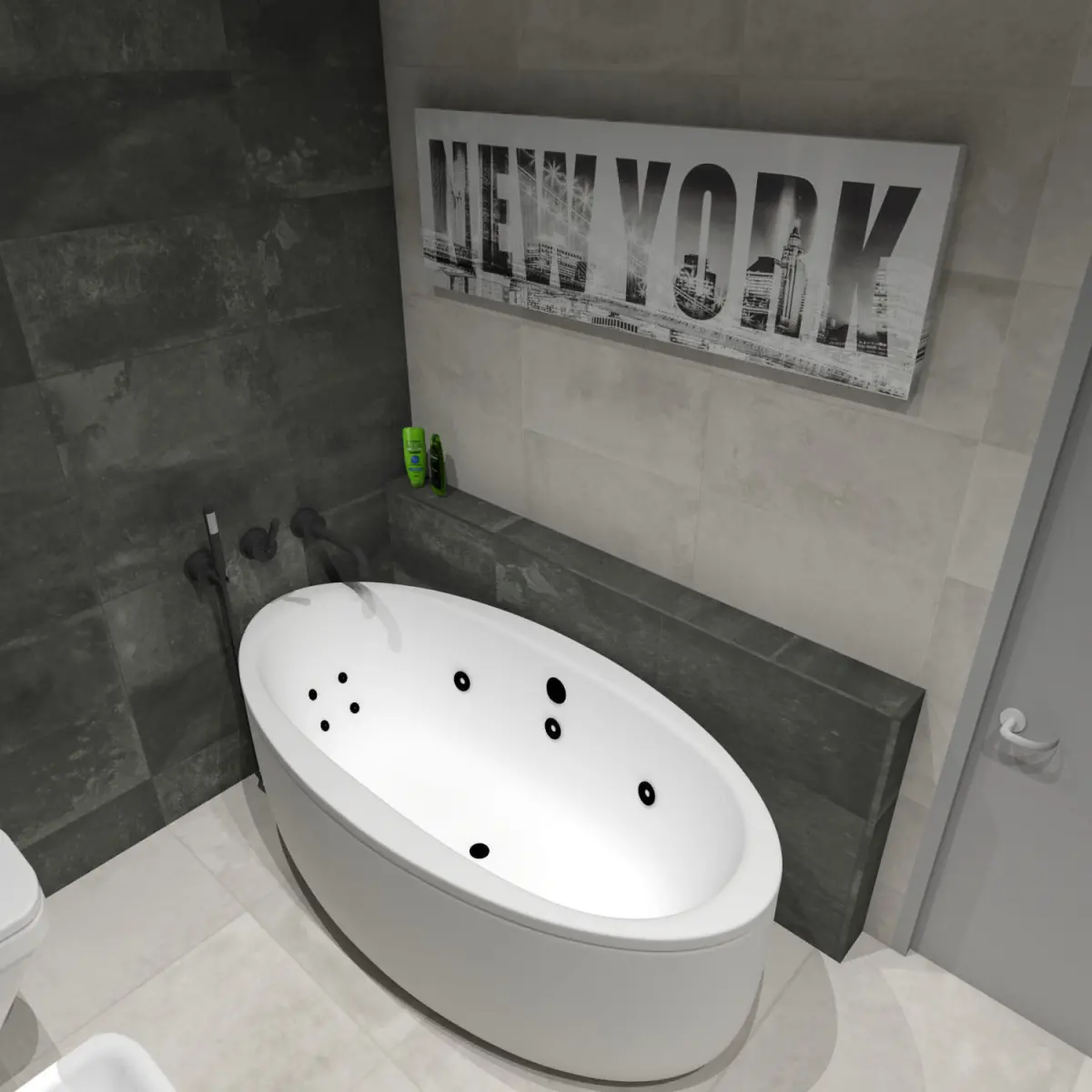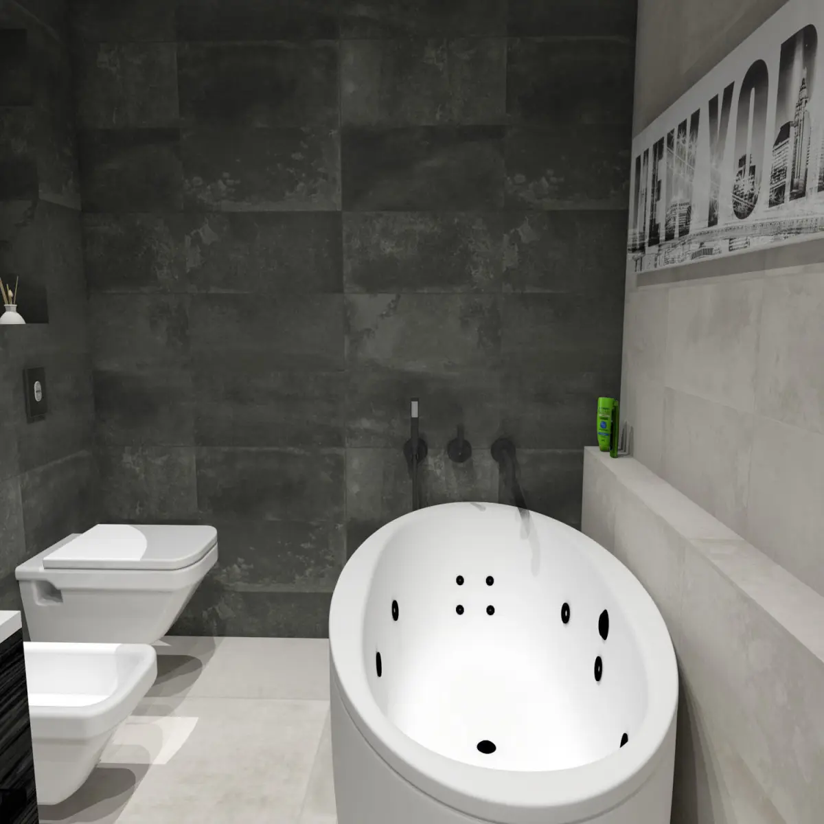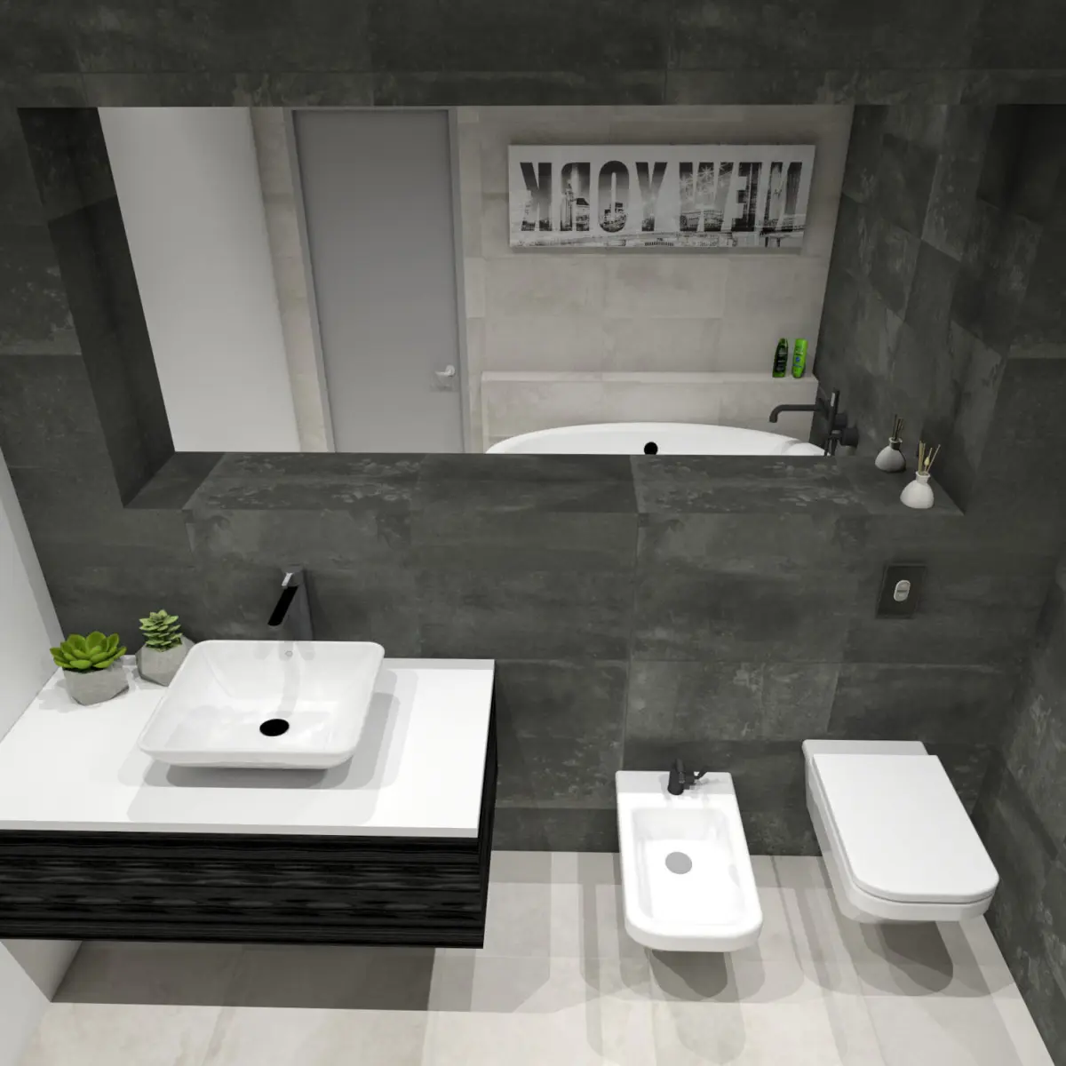 3D model of a modern medium sized bathroom with tiles. Model includes actual/ real life Italian design tiles, bath tub, wall hung toilet and bidet, vanity, as well as large mirror set deeper into the wall. Rectified tiles measurements and colors: Anthracite 30x60 cm + Bone 30x60 cm (walls), Bone 60x60 cm (floor). One wall left for paint.