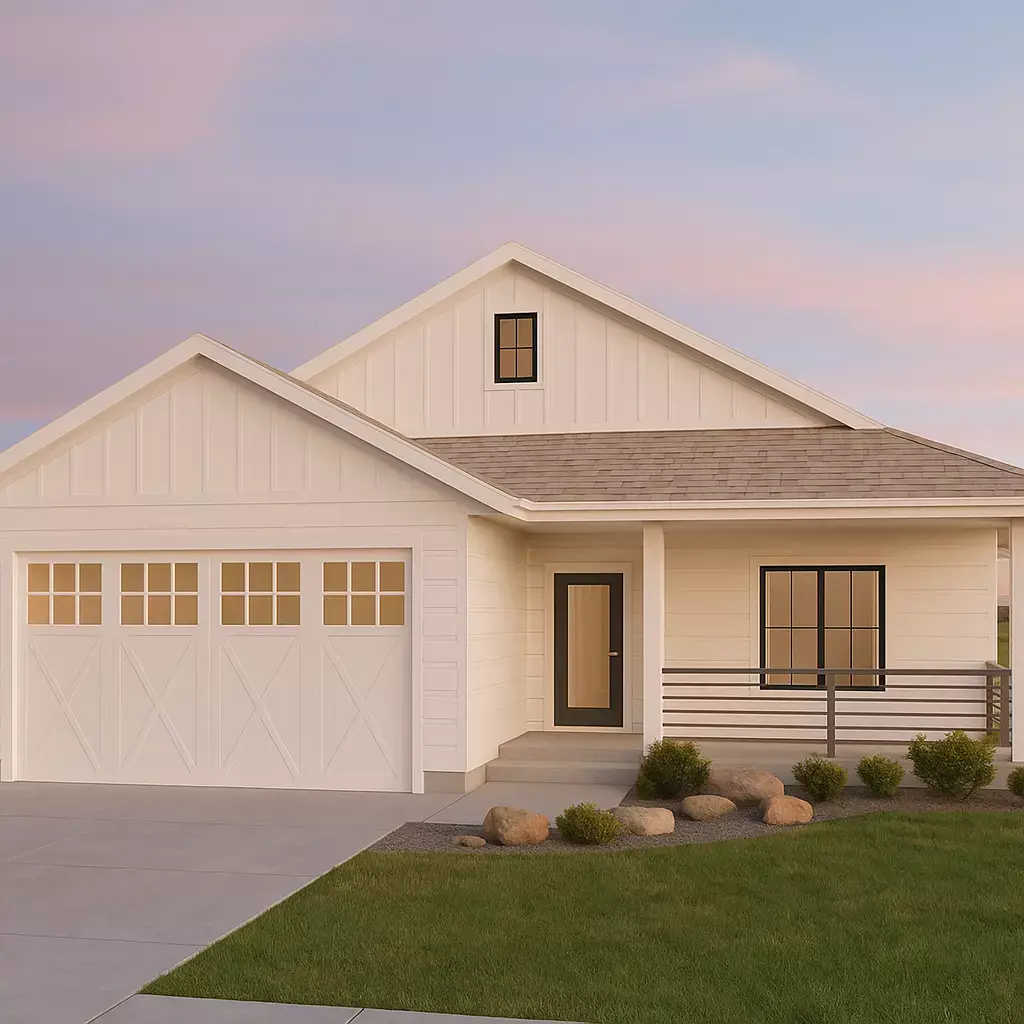 This modern single-story house plan features an open-concept design, complete with an outdoor carport and beautifully landscaped surroundings with greenery. The model is created in SketchUp and rendered with V-Ray for a realistic presentation.