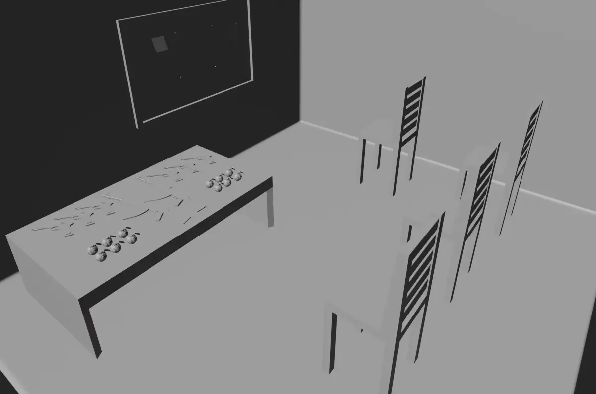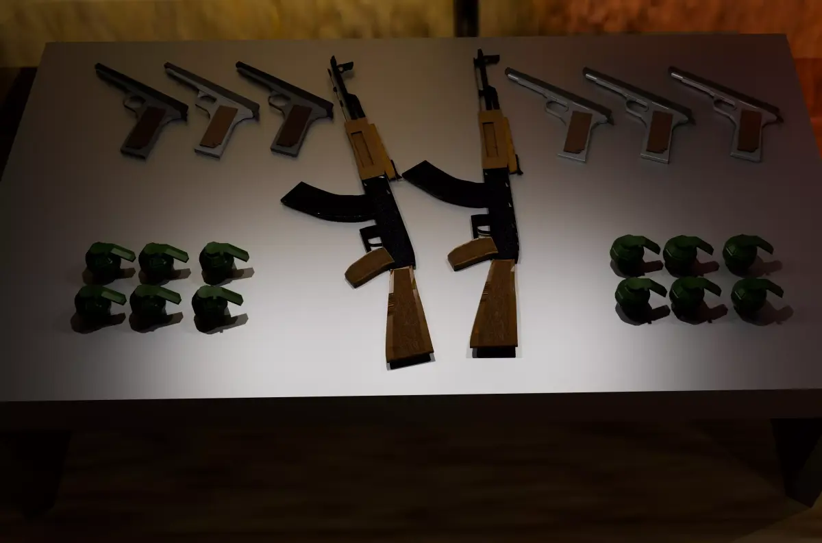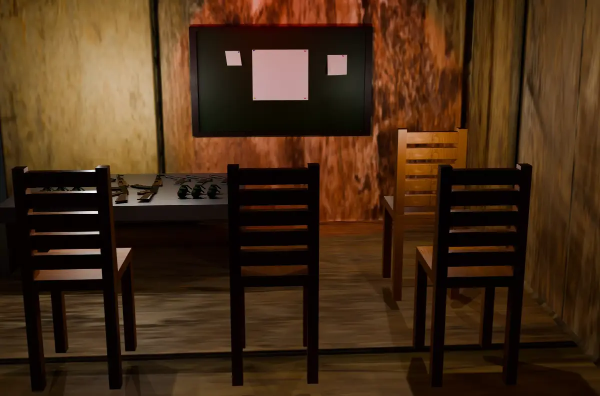 Operation Room — a dark, crime-planning environment. Features tactical weapons, grenades, a board with pinned notes, and cinematic lighting. Optimized with PBR textures and clean UVs. Suitable for games, renders, or concept art.