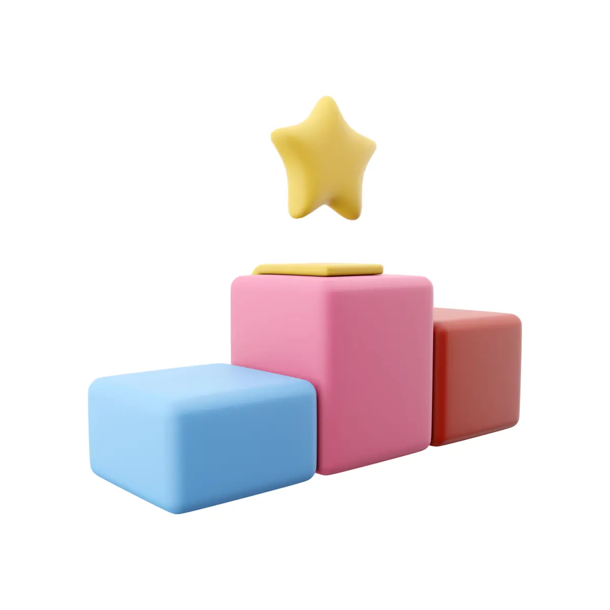 3D rendering Winners' podium with trophies, gold winners, and gold stars. Ceremonial pedestal caricature style awards for first, second and third place. 3d rendering winners' podium icon.