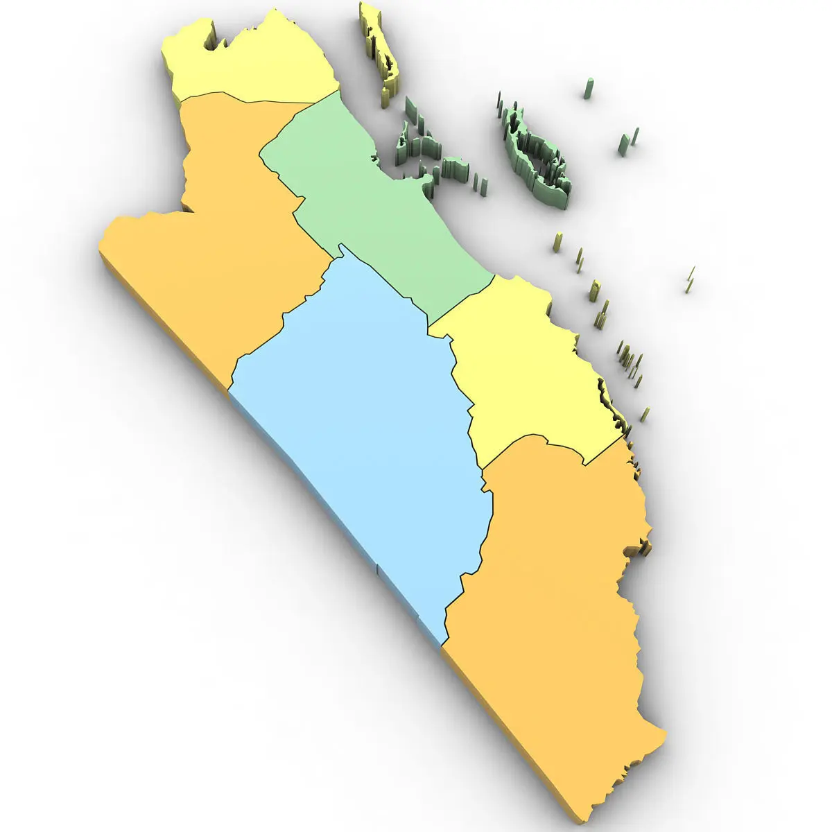 High poly 3d model of the map of Belize. Includes all the regions of Belize.