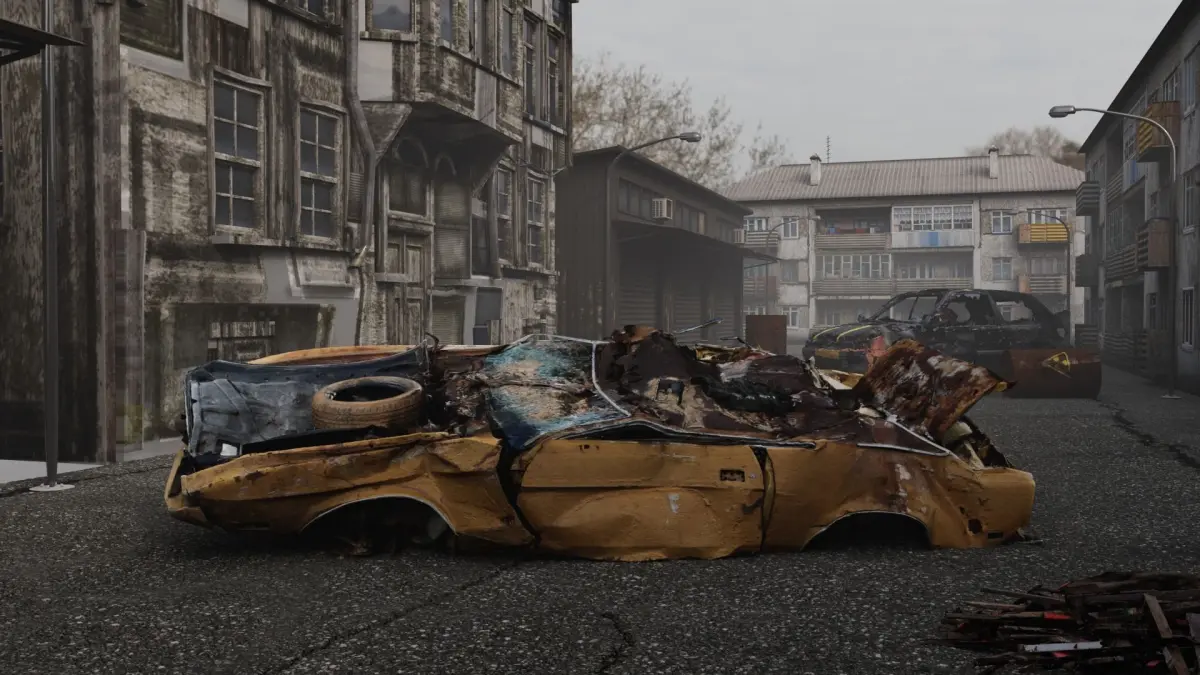 Includes 6 ruined buildings, 2 roads and 3 cars,. You can easily change the position of buildings or copy them to create a larger city. Designed to be modifiable.