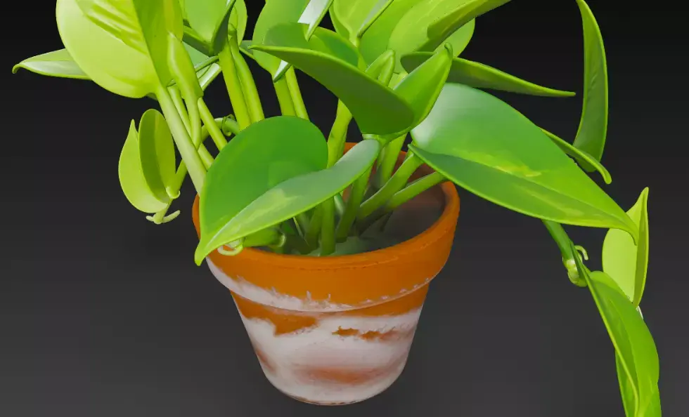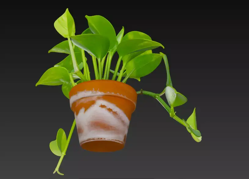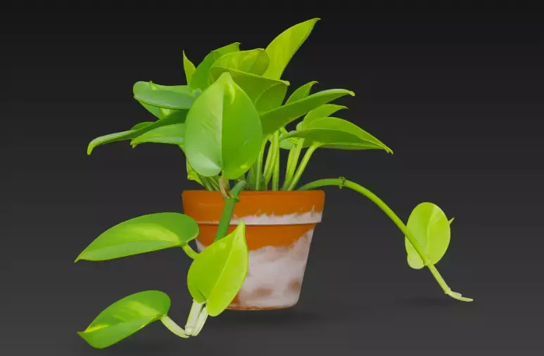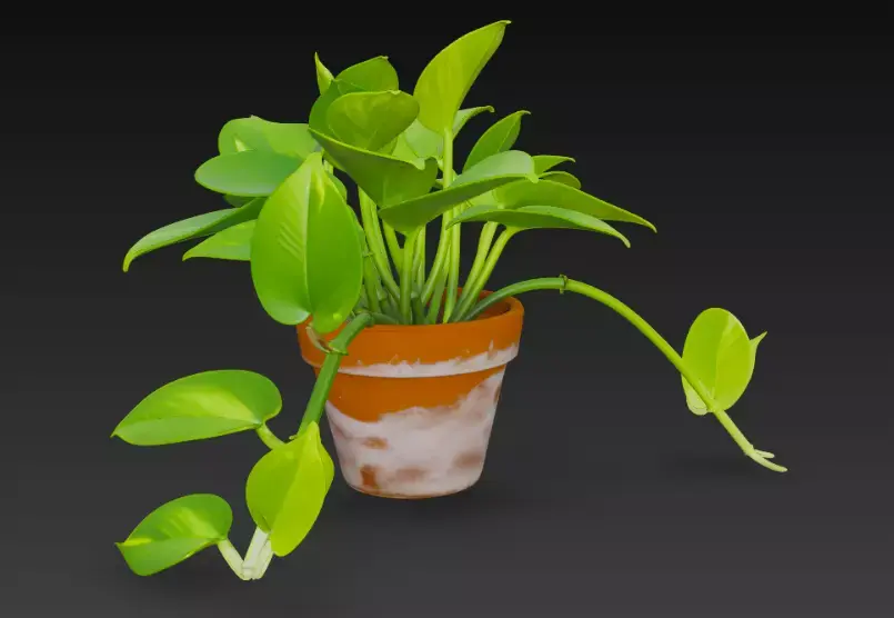 A vibrant 3D-rendered pothos plant pot with cascading heart-shaped green leaves, growing from a weathered terracotta pot with a unique white-streaked design, set against a dark background.