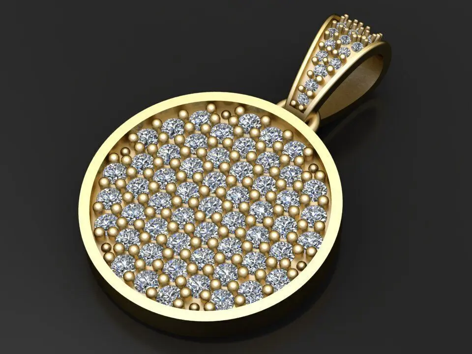 This elegant round pendant radiates opulence and refined craftsmanship. Featuring a fully encrusted surface of brilliant round-cut diamonds or cubic zirconia stones, this piece captures light from every angle, creating a dazzling and luxurious shimmer. The meticulously arranged pavé setting offers a seamless surface of sparkle, framed by a clean circular border. Both the gold and silver variations highlight the intricate stonework and ensure timeless appeal. The pendant loop is also embellished with matching stones, further enhancing its luxurious feel. This design is perfect for statement wear, ideal for both formal occasions and upscale everyday style.