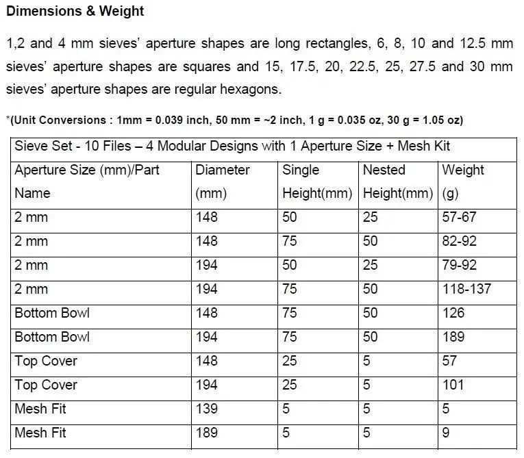 - You can purchase all parts with a discount at handy3dzz account or you can purchase only your desired aperture size sieve. Bottom bowl and top cover are included in all sieve purchasing options. Please see all the options in handy3dzz account.