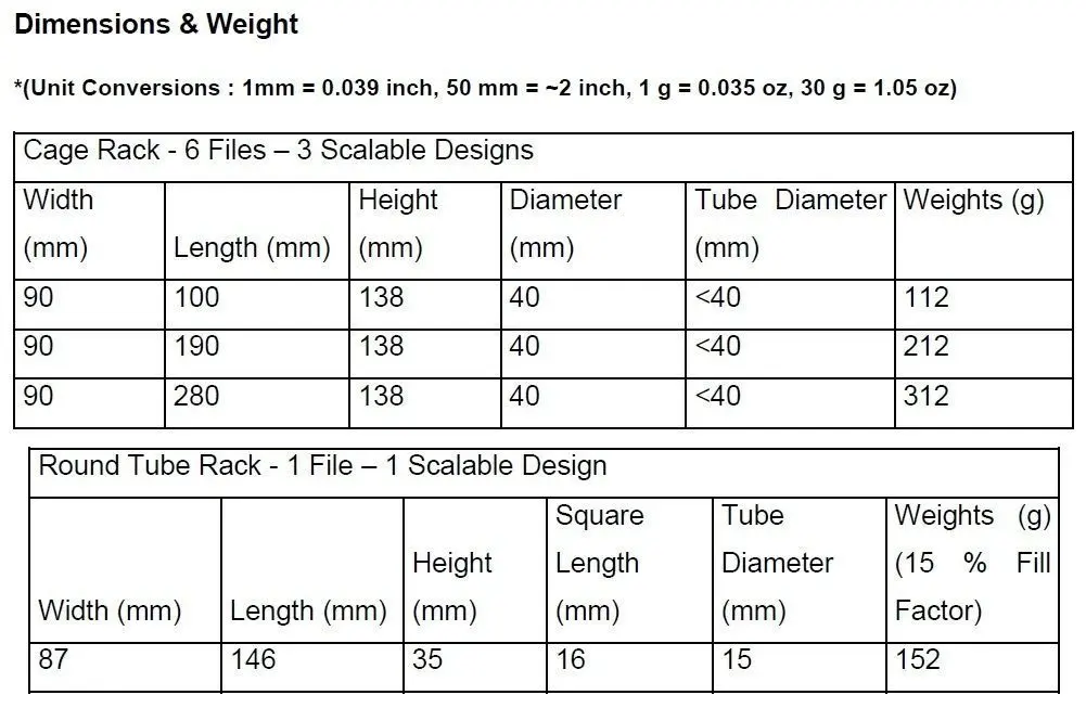- You can and should apply scaling for tubes with different dimensions, however, please do not forget to apply same scaling factor to each part in cage tube rack models.