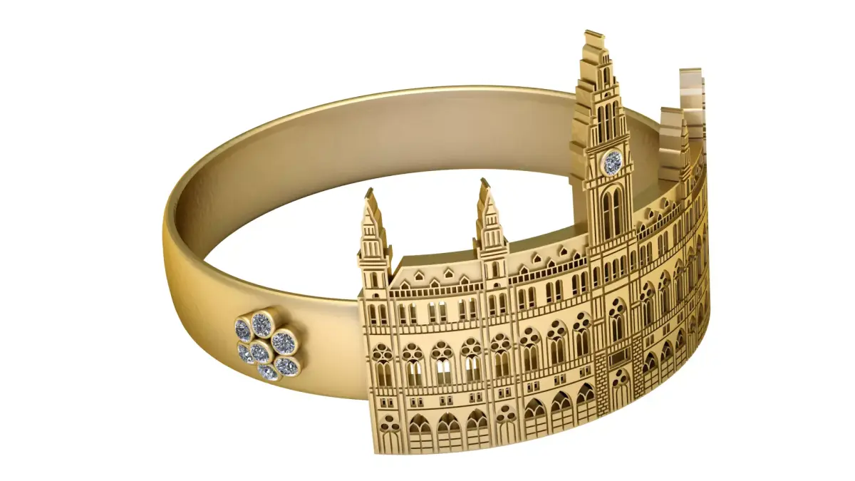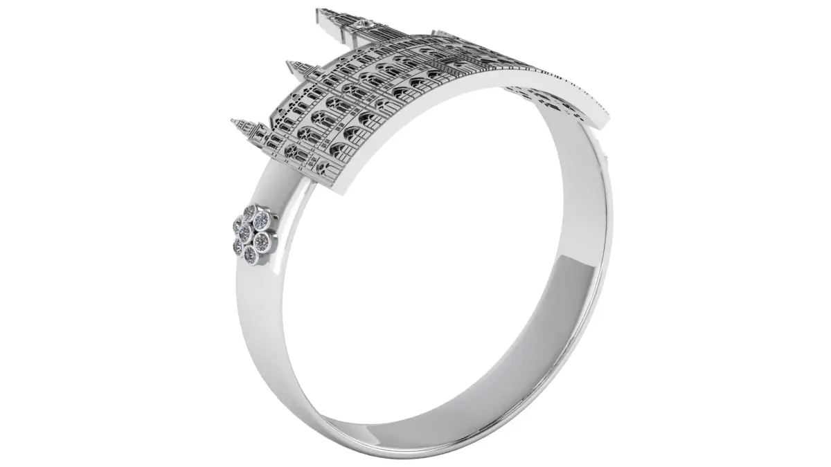 This 3D printable architectural landmark ring features a detailed miniature building design inspired by historic European architecture The intricate engraving highlights towers arches and windows with gemstone accents for an elegant finish This unique jewelry piece combines art culture and craftsmanship making it a perfect accessory for architecture lovers collectors and jewelry designers It is designed for high quality 3D printing and can be customized in different materials to create a stunning wearable masterpiece