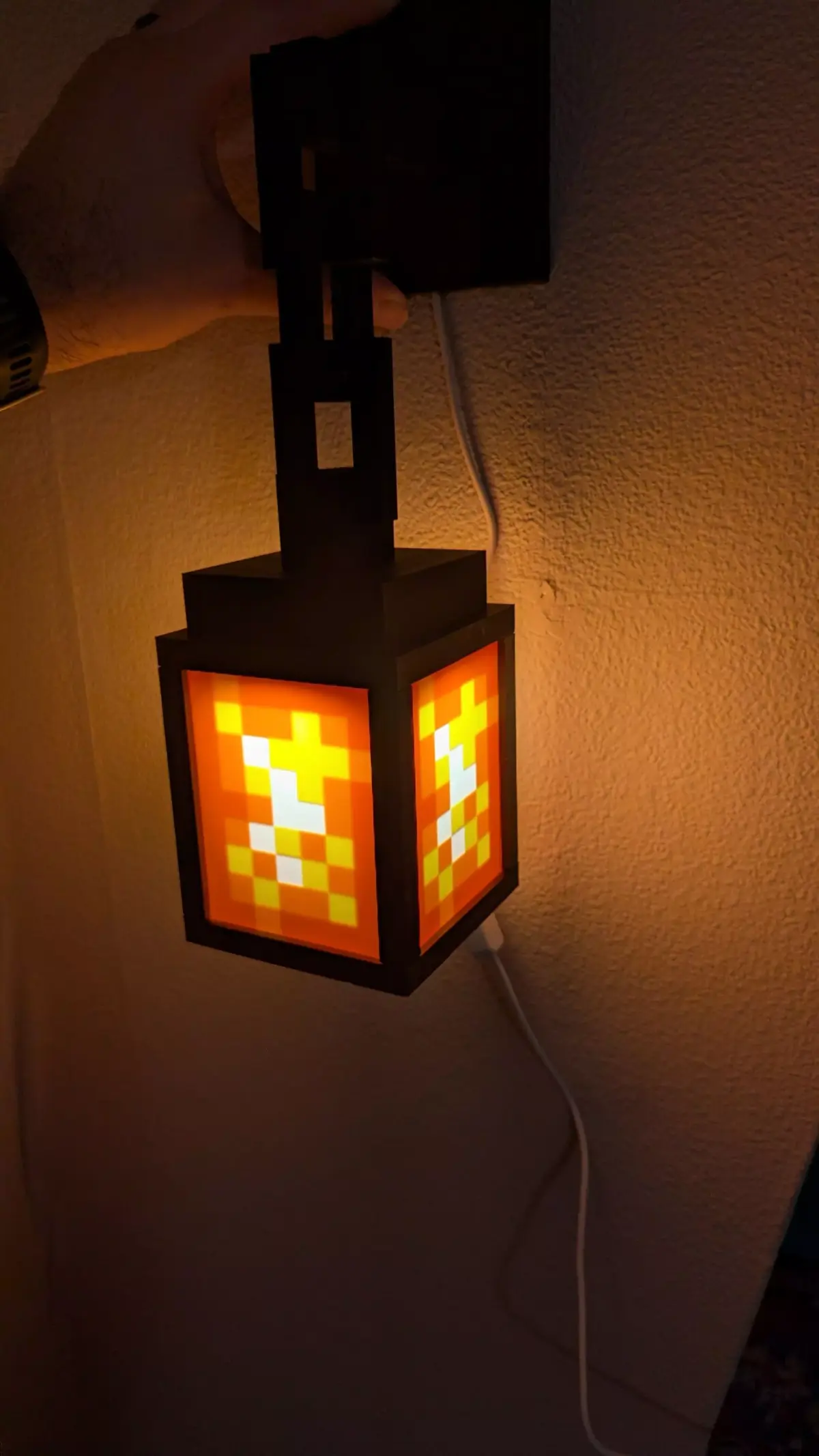 This is a 3D printable wall lamp inspired by a minecraft lantern.The panels are white on the outside but show yellow, orange and red when the light is turned on.I used the bambulab LED lamp kit 001 (ordered from ali express) for the lightsource itself.The wire is hidden in the chain and the holder and exits out of the backplate on the wall for a clean look.The whole print snaps together but I personally used a bit of glue on the chain.Minecraft Lantern.3mf contains the Bambustudio plates with all settings and colors set. You need black, white, yellow and red PLA for this print.The plates are colored by layer so AMS is not needed.