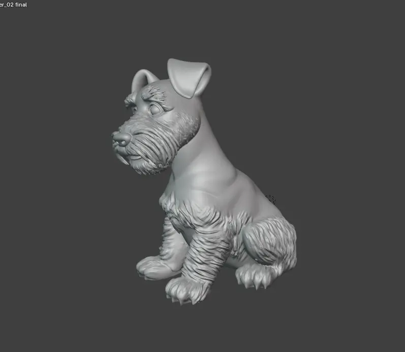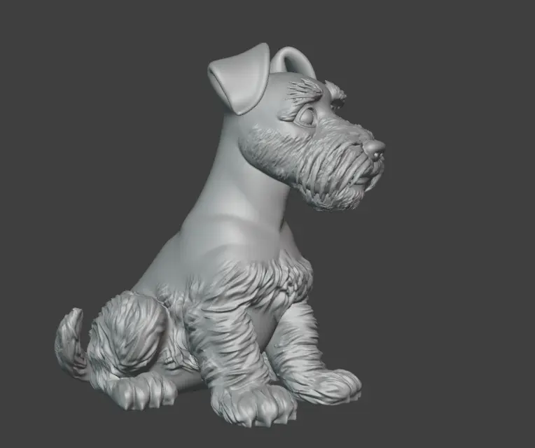 This is a detailed 3D model of a Schnauzer dog in a sitting position, featuring standard grooming style and floppy ears. Designed with care to capture the personality and charm of this beloved breed, it’s perfect for collectors, pet lovers, or as a custom gift.