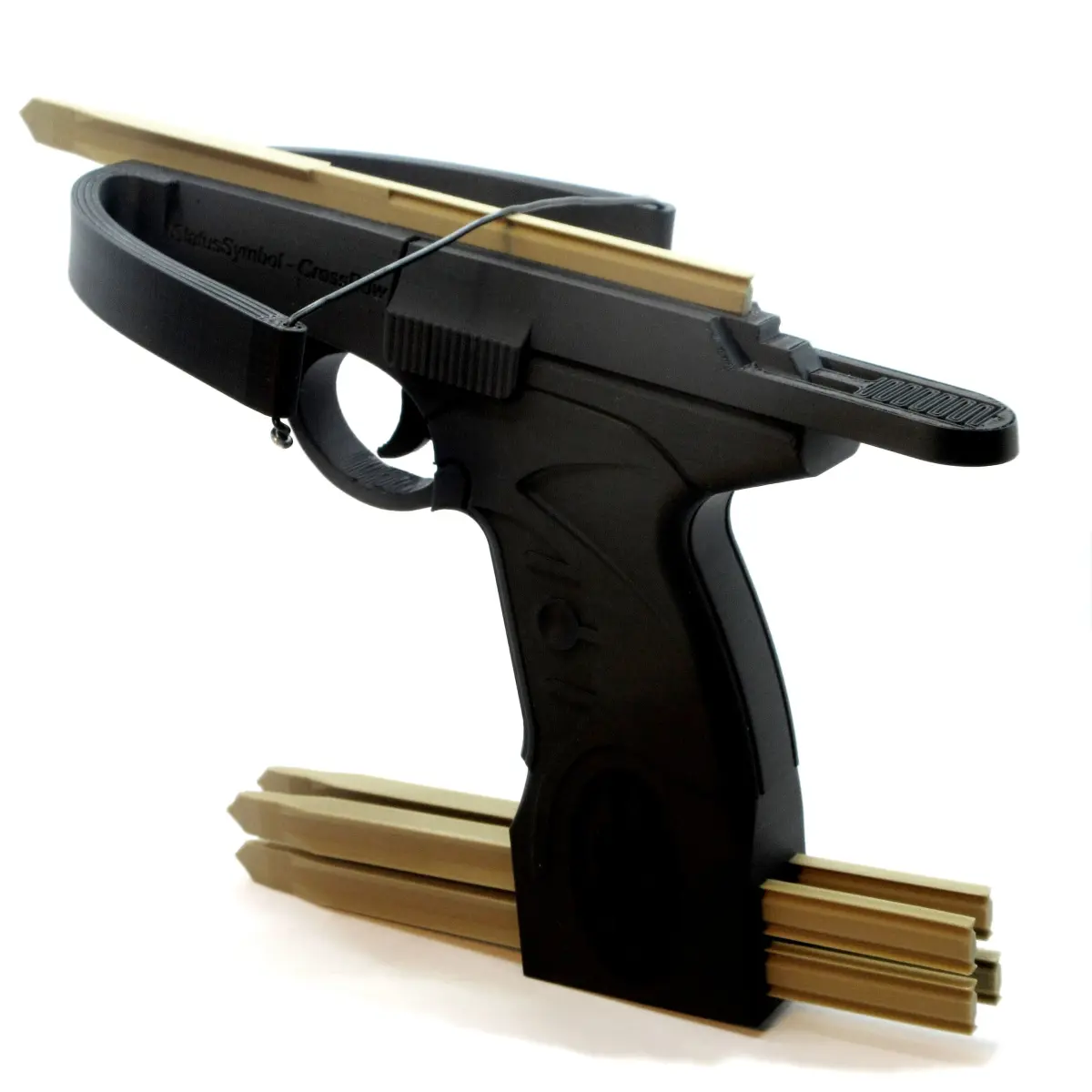 Our crossbow toy is designed to be printed with just one support structure placed in the return spring area. It utilizes an innovative system that incorporates multiple low-thickness blades for excellent flexibility. For the string, we recommend using rubber-coated copper wires with a diameter of 1.5mm. The crossbow is optimized to be printed on a printer with a minimum area of 18x18cm and positioned at a 45° incline.