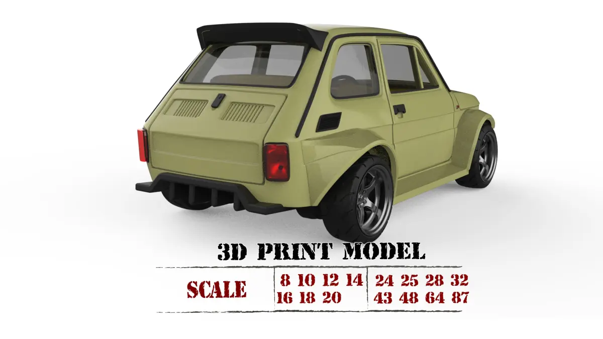 This 3D-printable Wide Body is designed to transform your Polski Fiat 126p (Maluch 126p) into a wider, sportier version. Inspired by classic racing cars, this tuning kit is perfect for scale model collectors, RC enthusiasts, and diecast restorers.