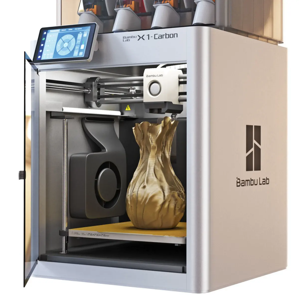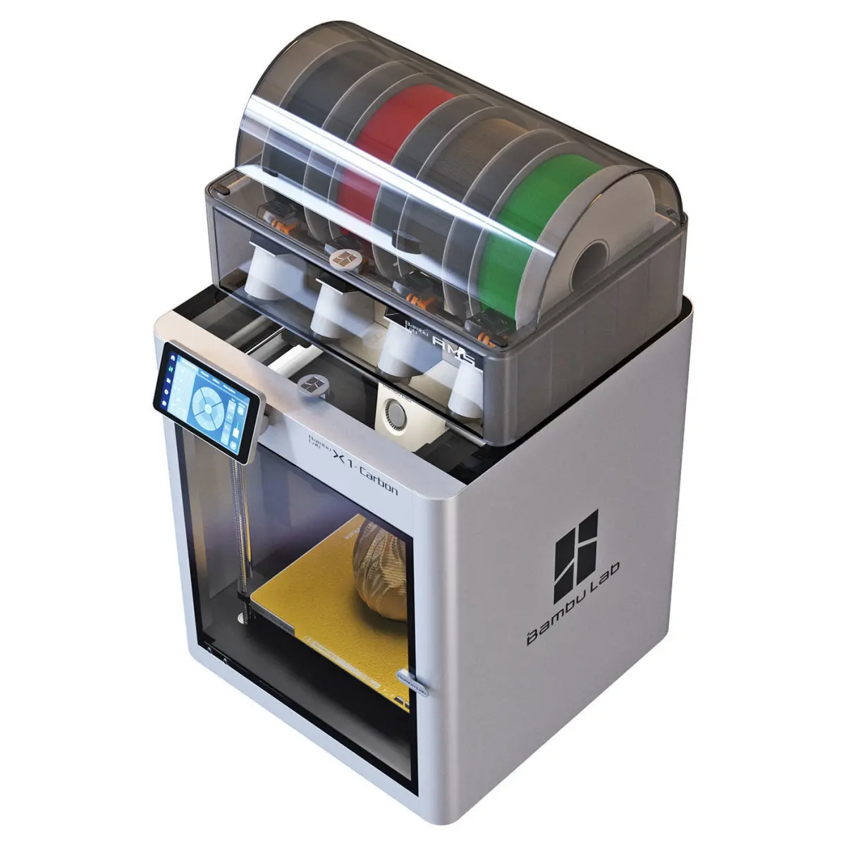 BambuLab X1 Carbon 3D printer with AMS. Turbosmooth filament feeding system is included only for rendering.