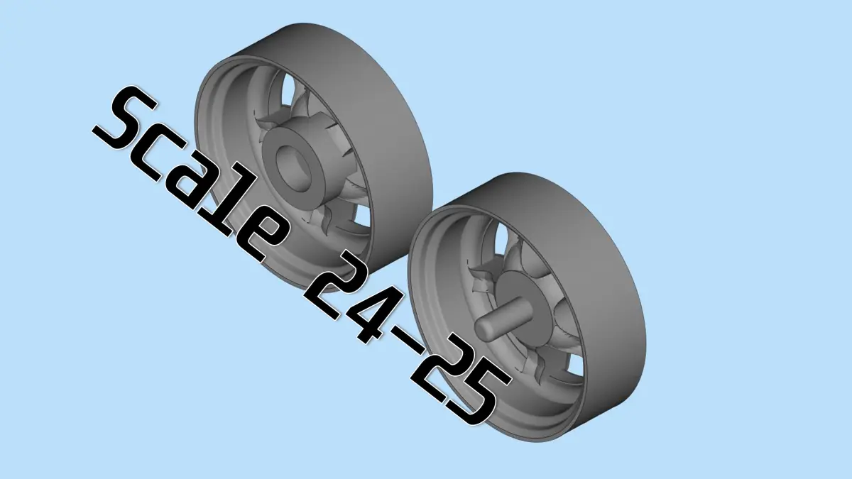 The *.stl files are in the *.zip archive. -Rims (21 mm 19 inches in 1/24 scale)-Tire (31 mm 30 inches in 1/24 scale)-Width tires for scale 24: •10mm •11mm •13mm
