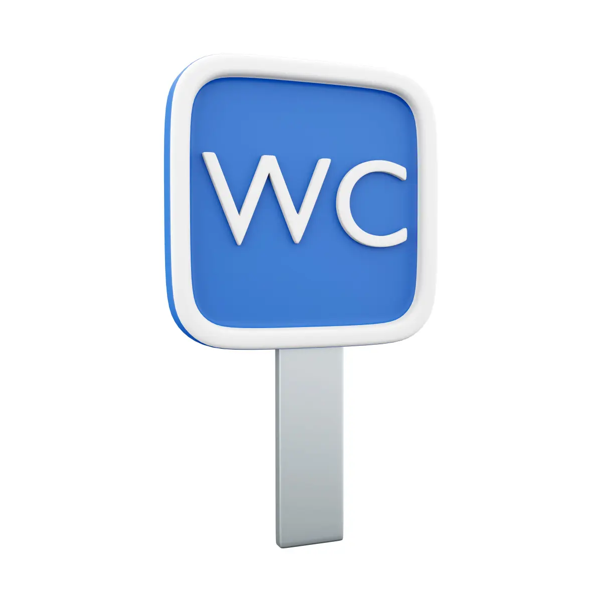 3d render public toilet road sign. Blue square road sign with WC text inside. The toilet icon is isolated on white background. 3d rendering toilet sign, cartoon icon