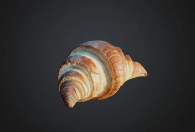 This 3D model showcases a beautifully detailed croissant, with its signature flaky layers and golden-brown crust. The model captures the light, buttery texture of the pastry, making it ideal for bakery scenes, food product visualizations, or culinary games. Whether used in a breakfast setting or a café environment, this realistic croissant will add a touch of authenticity and visual appeal to any project.