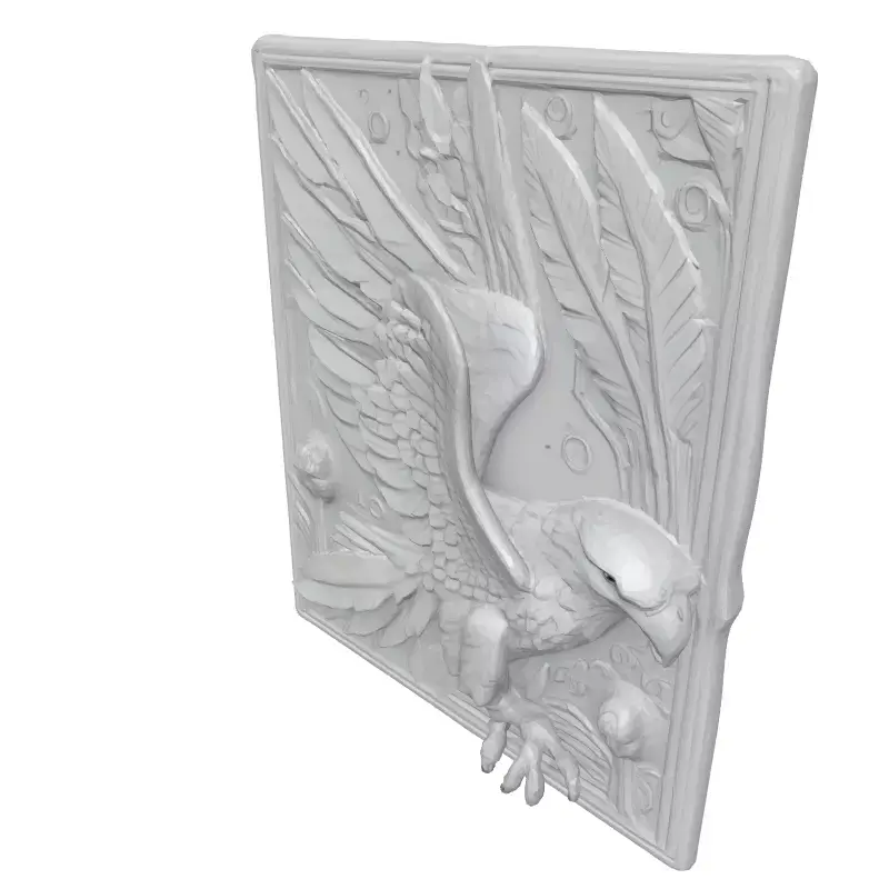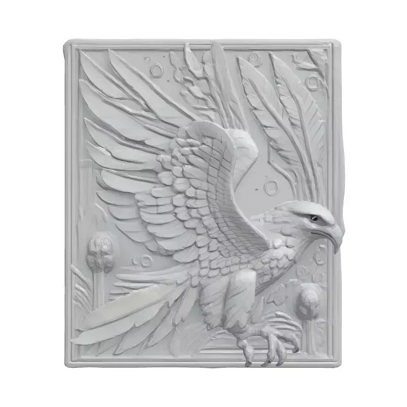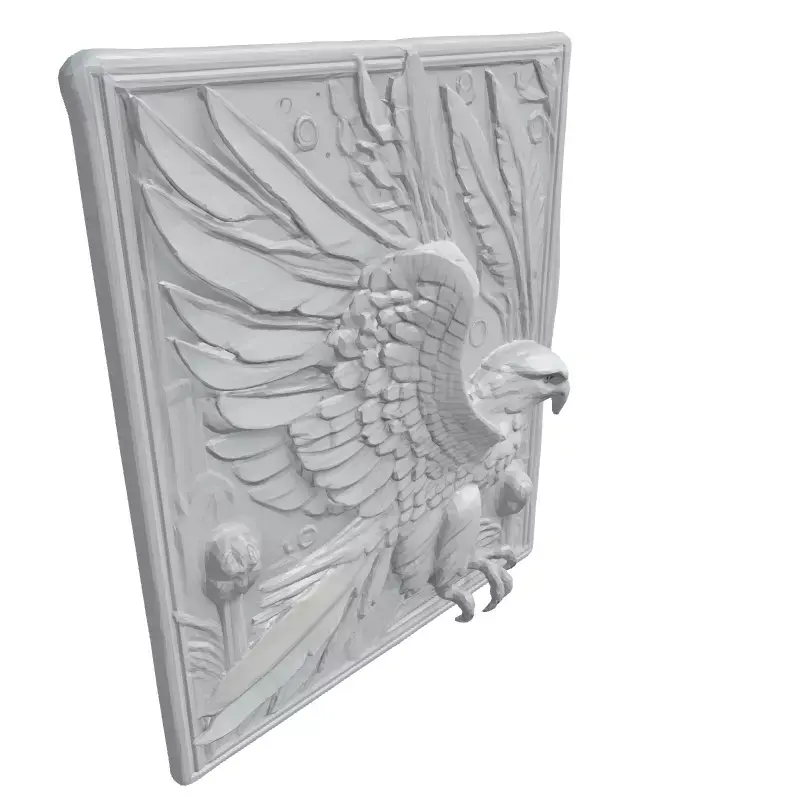 This intricate 3D model depicts a majestic eagle in relief, captured mid-flight, surrounded by stylized feathers and floral elements within a framed panel. Ideal for CNC machining, this design is perfect for creating stunning wall art, decorative panels, or architectural embellishments. It can be used in various applications, including interior design, home decor, art installations, and customized gifts. Available in multiple formats (STL, OBJ, FBX), the model features high-resolution details suitable for close-up renders and 3D printing. It has clean geometry, optimized for CNC milling. The model is ready for immediate use in your projects and can be scaled to any size without loss of detail. Its pristine white finish allows for versatile customization, making it suitable for painting, texturing, or material application to match your desired aesthetic. The relief design adds depth and sophistication, offering a unique artistic element to any space. Whether integrated into a modern or classical setting, this Eagle Relief Panel promises to be a captivating focal point.