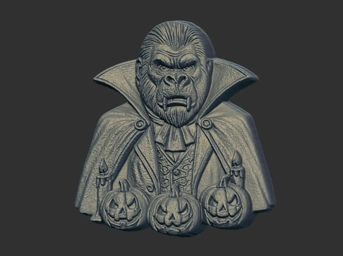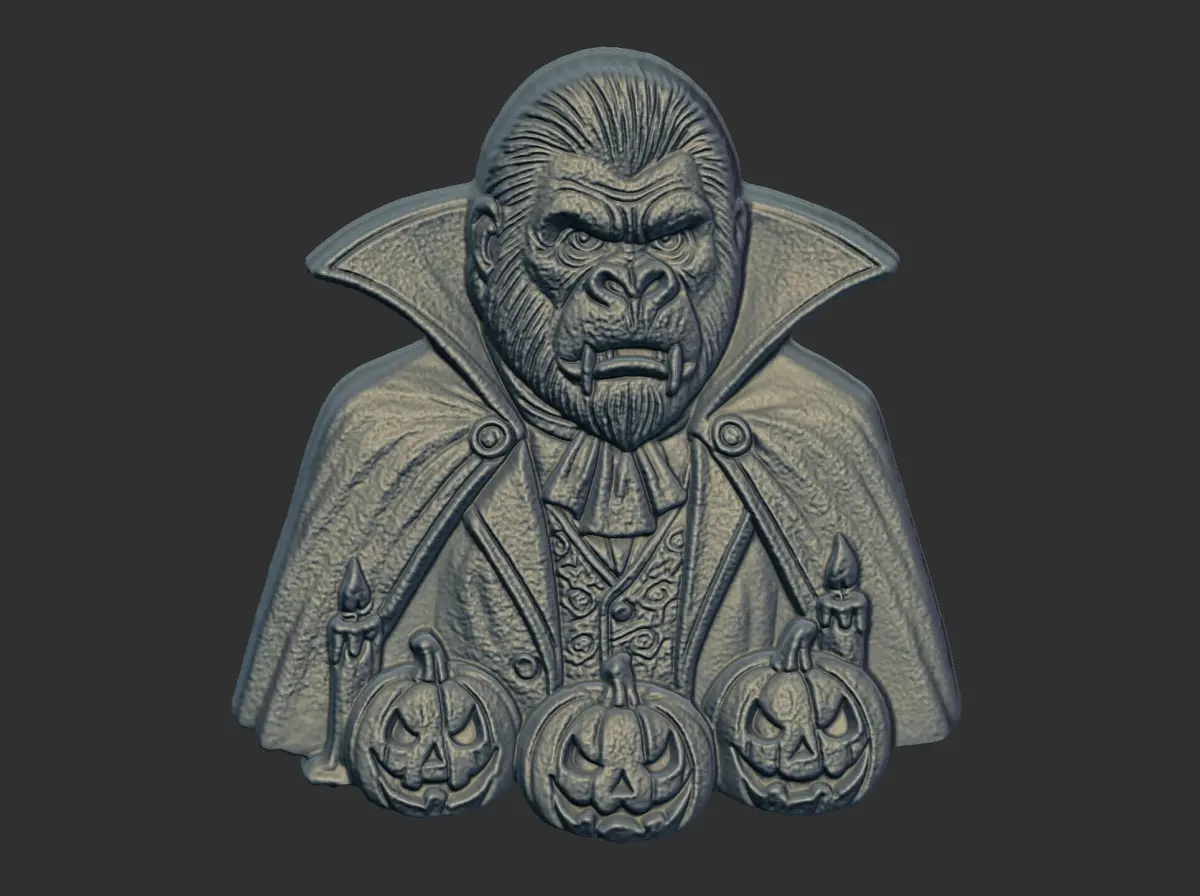 The image shows a 3D render of a gorilla bust dressed as a vampire, complete with a cape, formal attire, and fangs. Three small, carved pumpkins are positioned at the base of the bust, and two lit candles flank the pumpkins. The gorilla's expression is stern, and the overall aesthetic suggests a Halloween or gothic theme. The rendering is detailed, showing textures and shading that give the piece a three-dimensional quality.