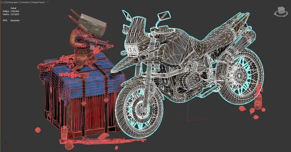 3D rendered scene featuring a rusty motorcycle and a character standing on a blue and red crate. The character seems to be a soldier or a figure in military attire, holding a large weapon. Around the crate and the motorcycle, there are various small objects such as bottles and grenades scattered.