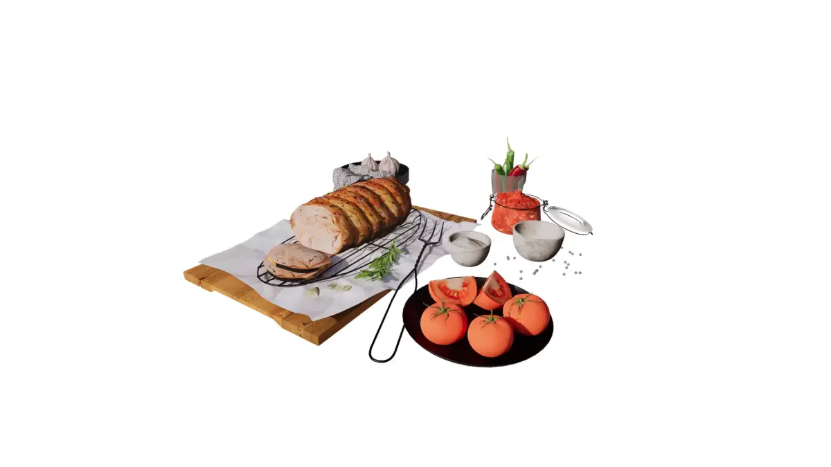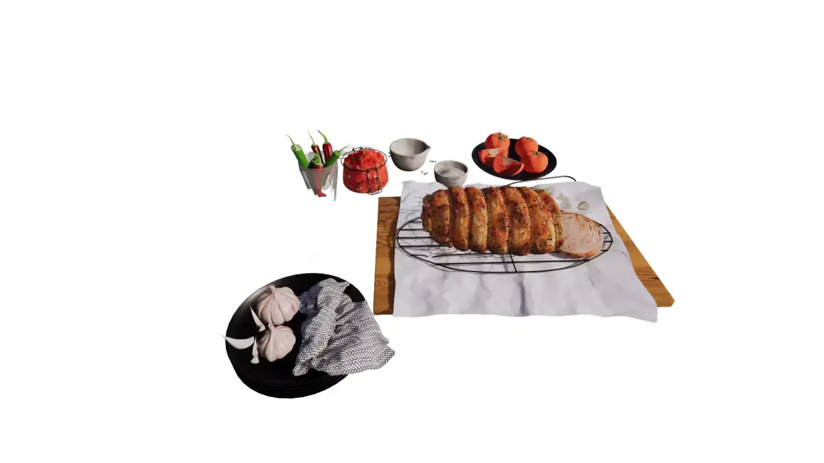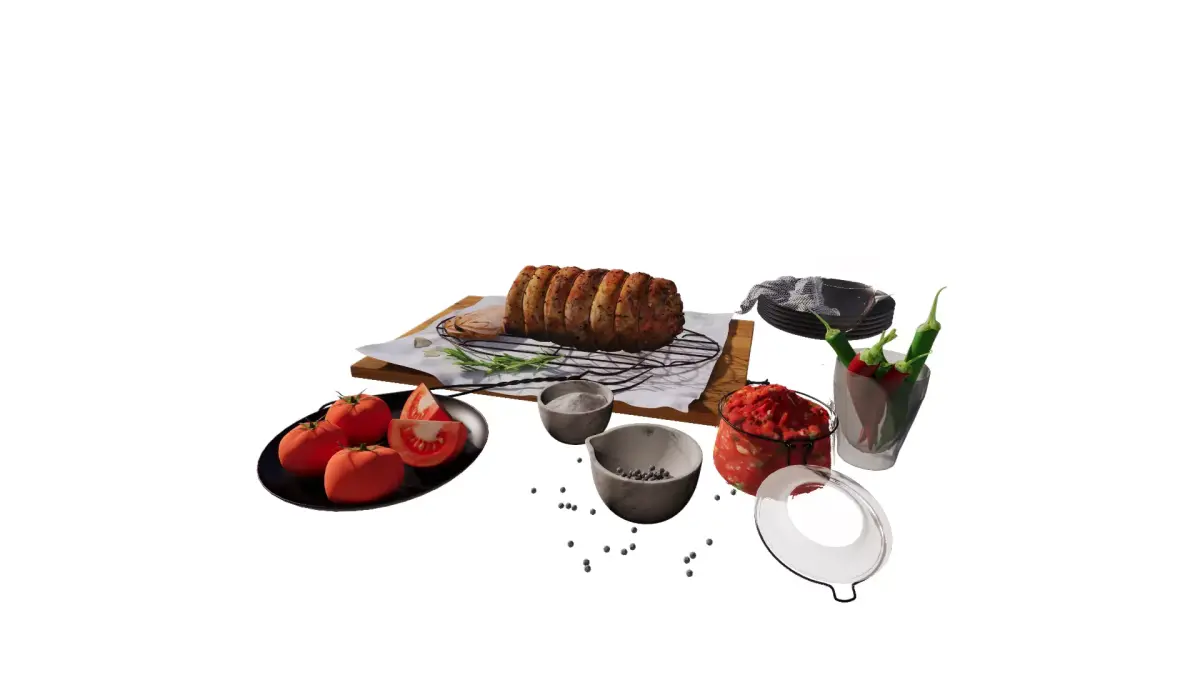 This detailed 3D model captures a beautifully arranged roast dinner scene, perfect for food visualizations, restaurant mockups, or kitchen interior renders. The centerpiece is a perfectly sliced herb-crusted roast served on a wooden cutting board, accompanied by fresh rosemary, garlic, and a meat fork. Surrounding elements include whole and sliced tomatoes, chili peppers, tomato sauce in a jar, salt and pepper bowls, garlic bulbs, elegant glassware, and black dishware. With realistic textures, lighting, and food styling, this scene brings warmth and authenticity to any culinary-themed 3D project.