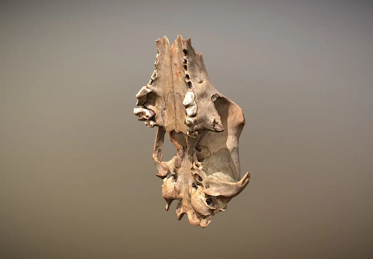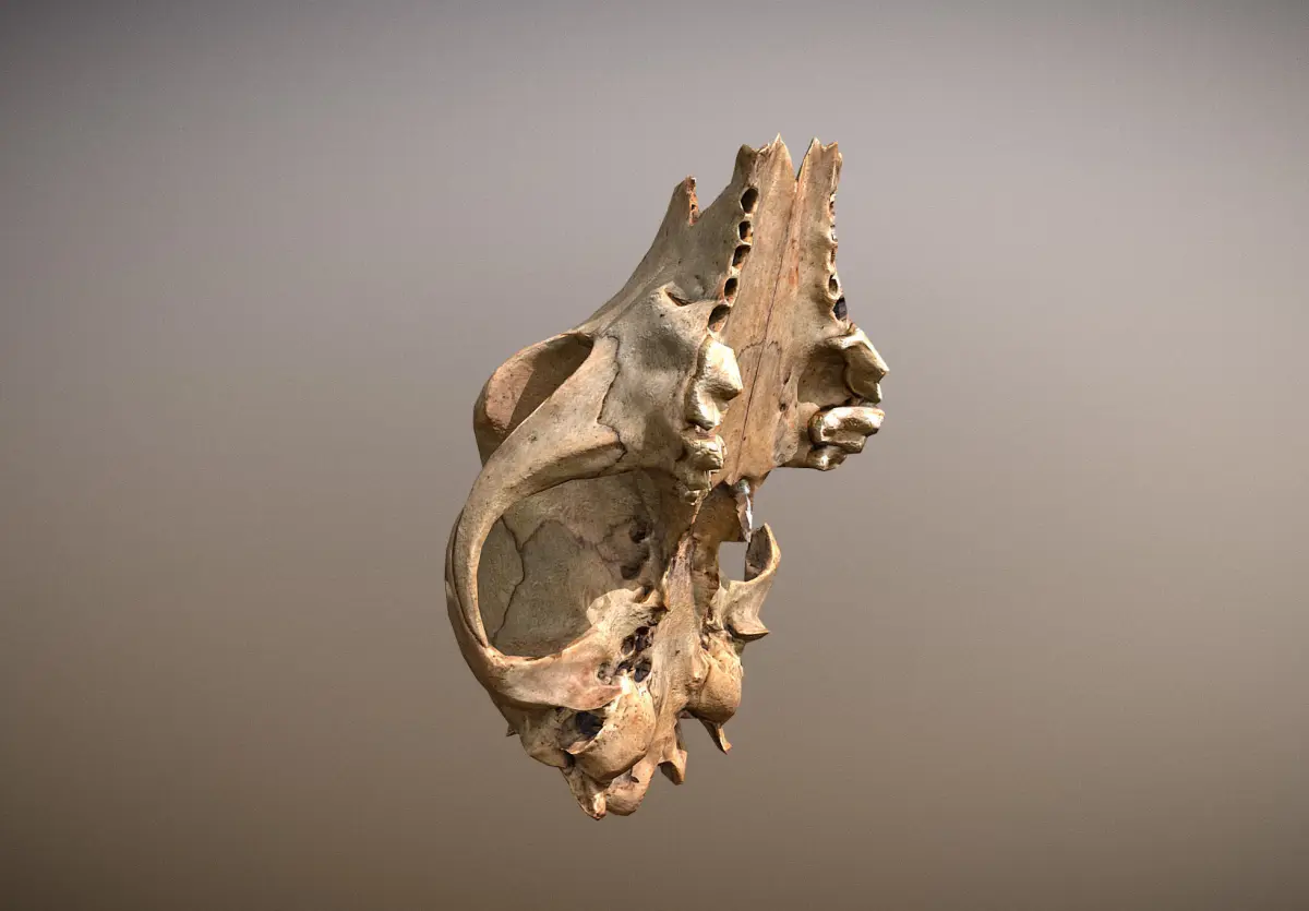 A 15cm length animal skull remains with 4k textures, some fallen off teeth and broken cheekbone.